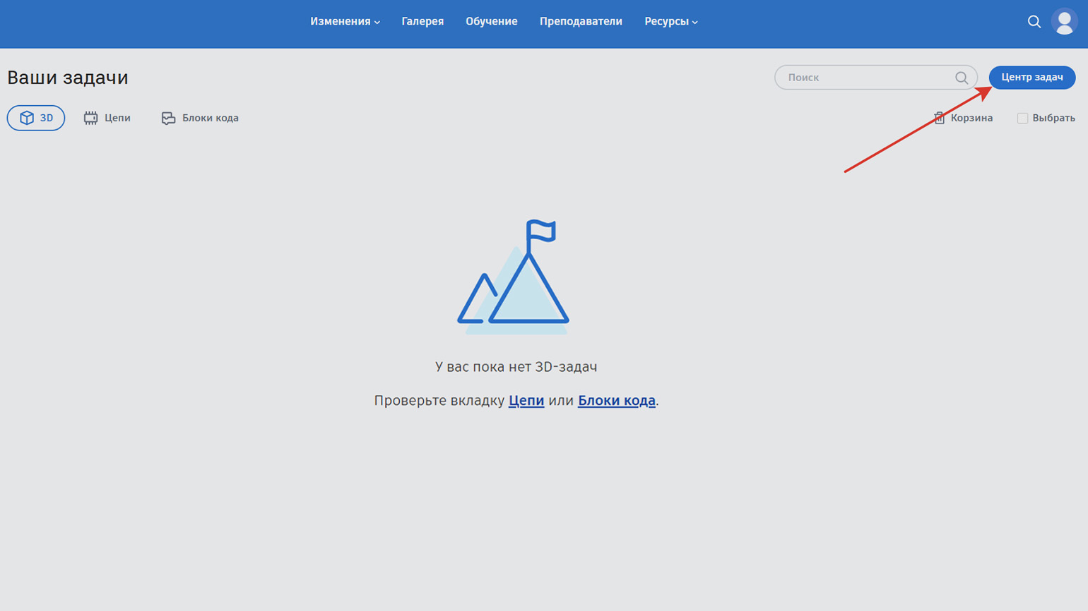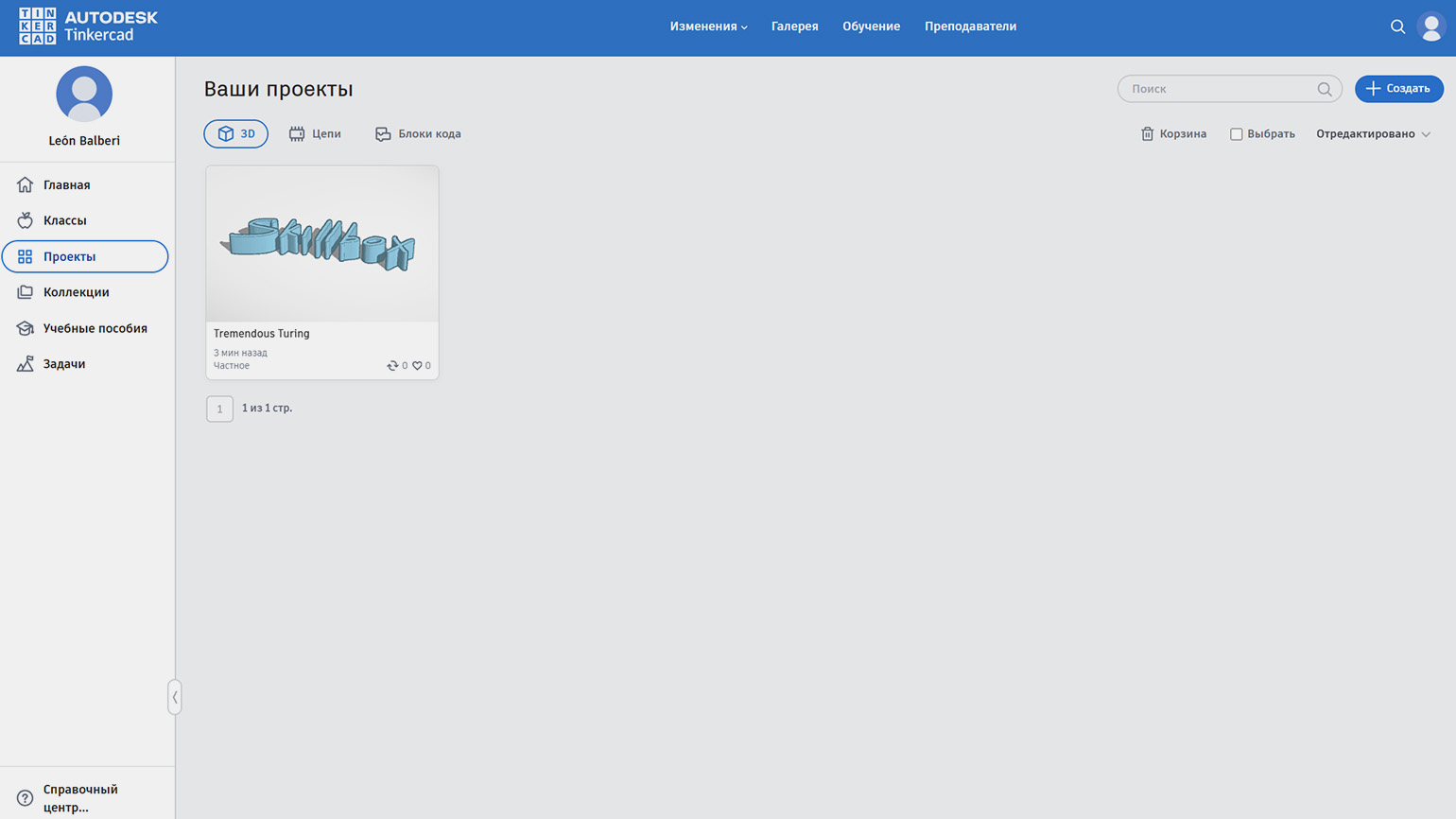 - «Учебные пособия» — здесь собраны пройденные и активные уроки, а также есть ссылка на Учебный центр Tinkercad.
