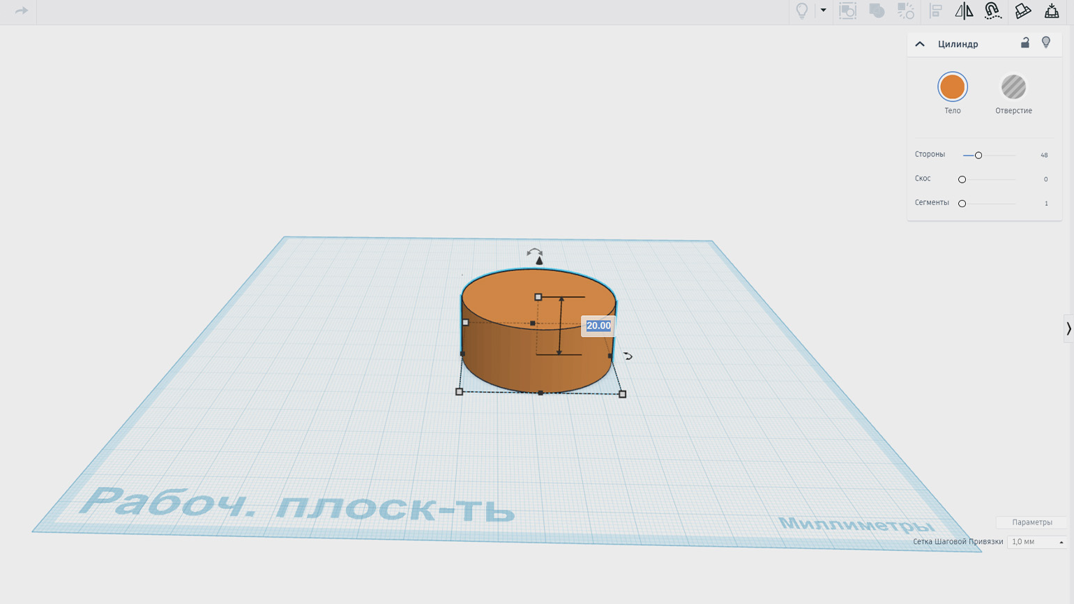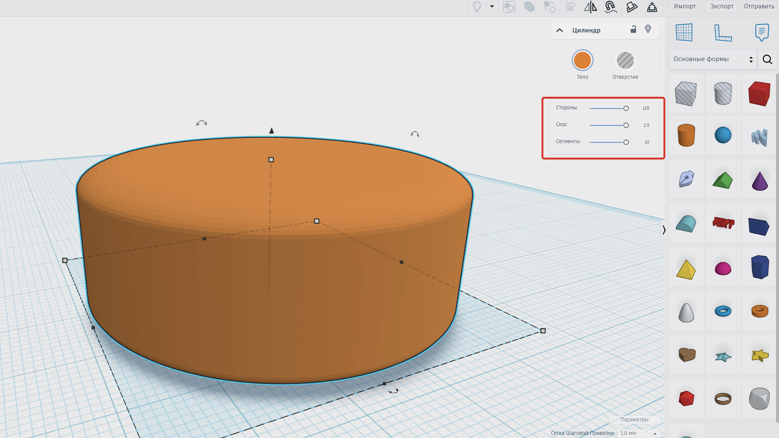 3D-модели в Tinkercad могут быть обычным объектом — «Телом» или «Отверстием». Эти роли можно выбрать во вкладке справа, если выделить модель в рабочем пространстве. В этом же окне находятся дополнительные параметры, которые зависят от типа примитива. Например, у цилиндра есть настройки количества граней («Стороны»), размера фаски острых углов («Скос») и плавности фаски («Сегменты»).