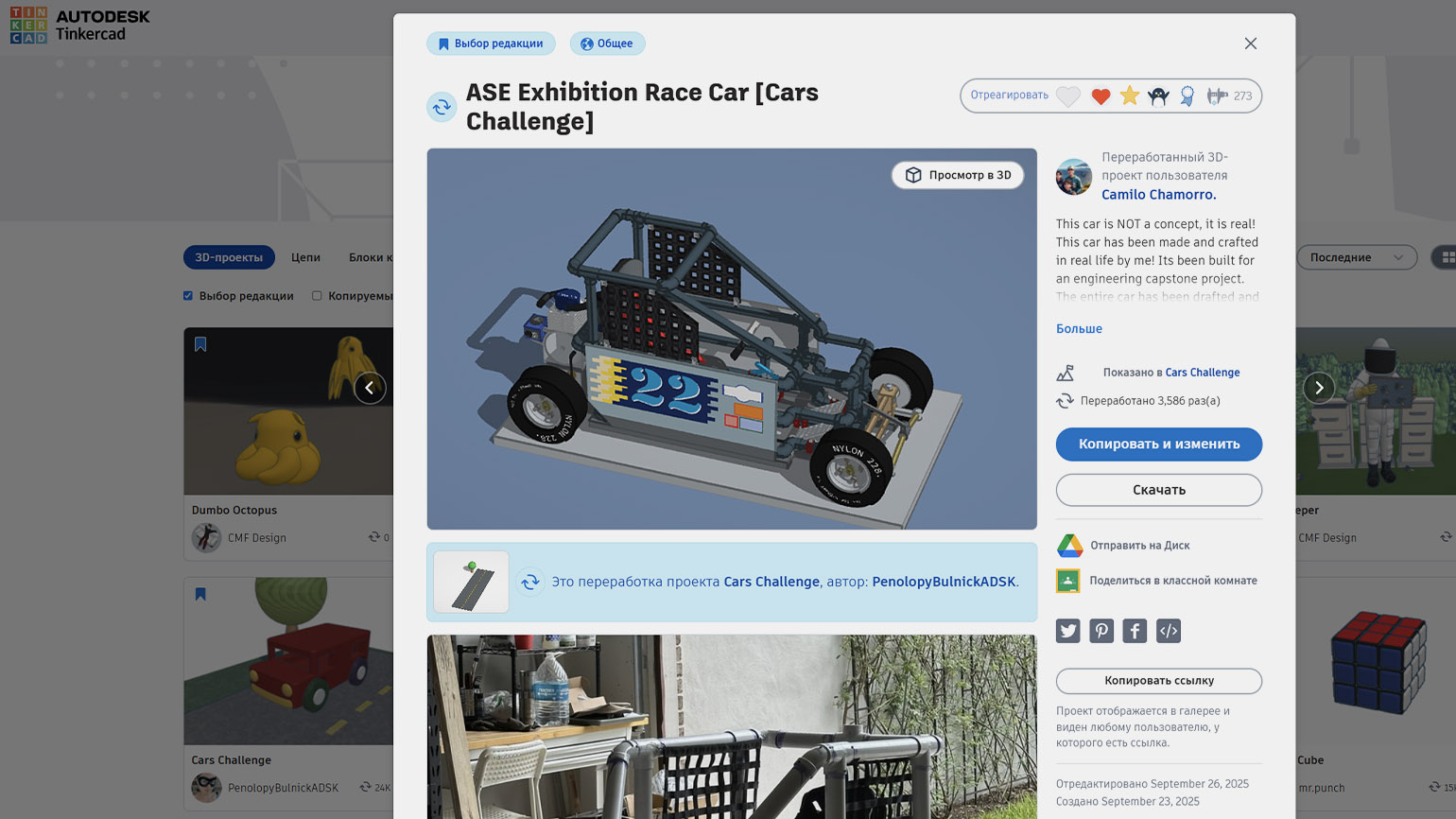 Изменение и копирование других авторских проектов. Вы можете выбрать уже готовый дизайн из галереи Tinkercad, нажать на кнопку «Копировать» и работать с этим проектом в своём рабочем пространстве, менять его. Это полезно для изучения техник других авторов.