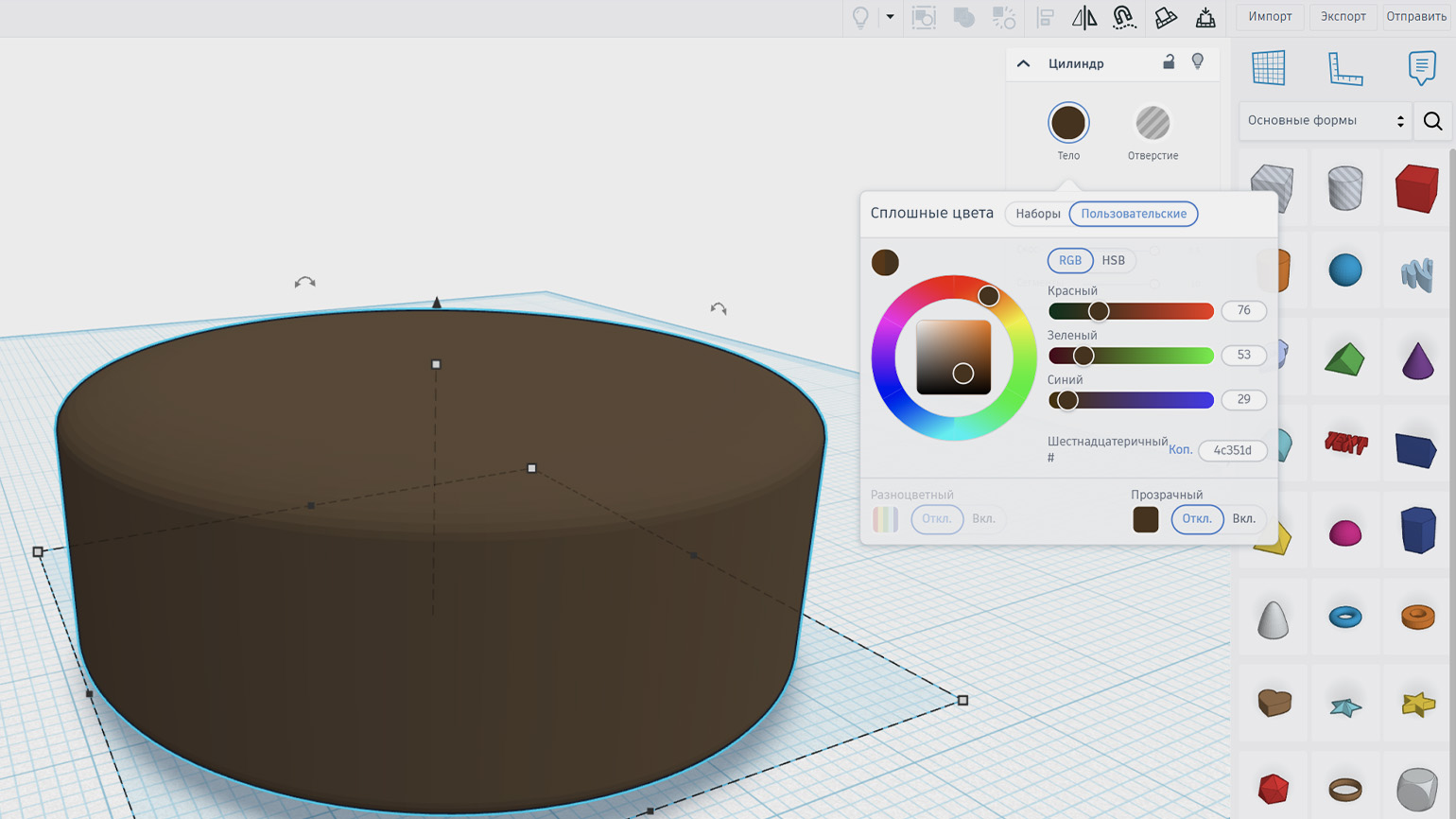 Чтобы изменить цвет объекта, нажмите на кнопку «Тело» и выберите нужный оттенок. При желании вы можете сделать фигуру полупрозрачной или задать свой цвет во вкладке «Пользовательские».
