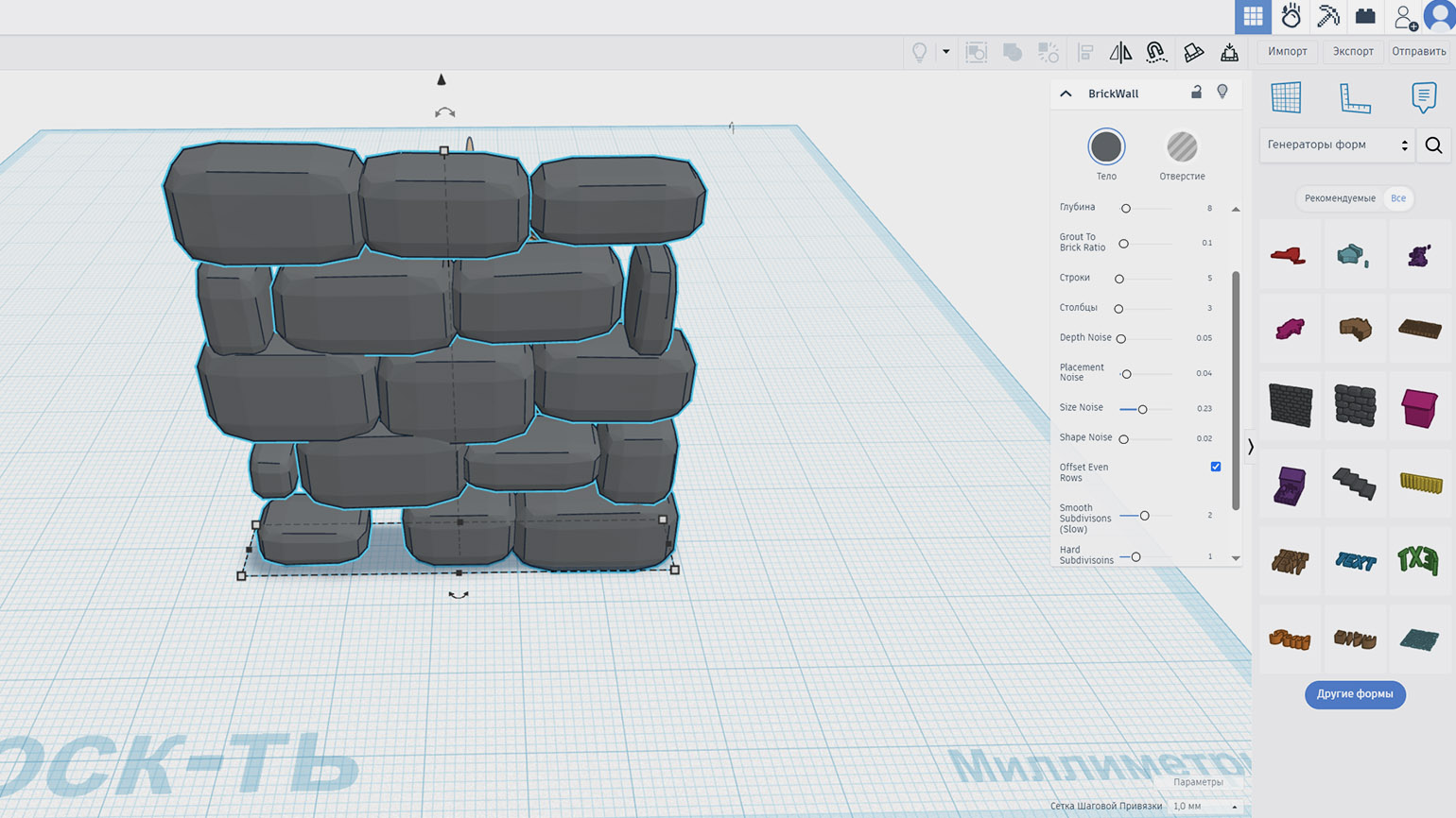 Работа с генераторами форм. В нижней части панели с коллекциями моделей находится вкладка «Генераторы форм» — это специальные параметрические объекты с гибкими настройками. В отличие от обычных фигур, каждый генератор имеет собственный набор параметров, которые вы можете регулировать через меню.