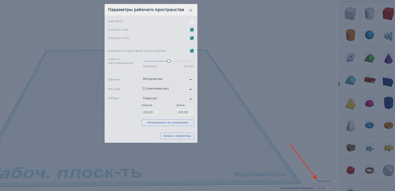 Если вы нажмёте на кнопку «Параметры» в правом нижнем углу, то сможете изменить формат плоскости, её масштаб и метрическую систему. Также учтите, что все изменения в Tinkercad сохраняются автоматически. Поэтому, если вам нужно прервать сеанс, просто закройте окно браузера.