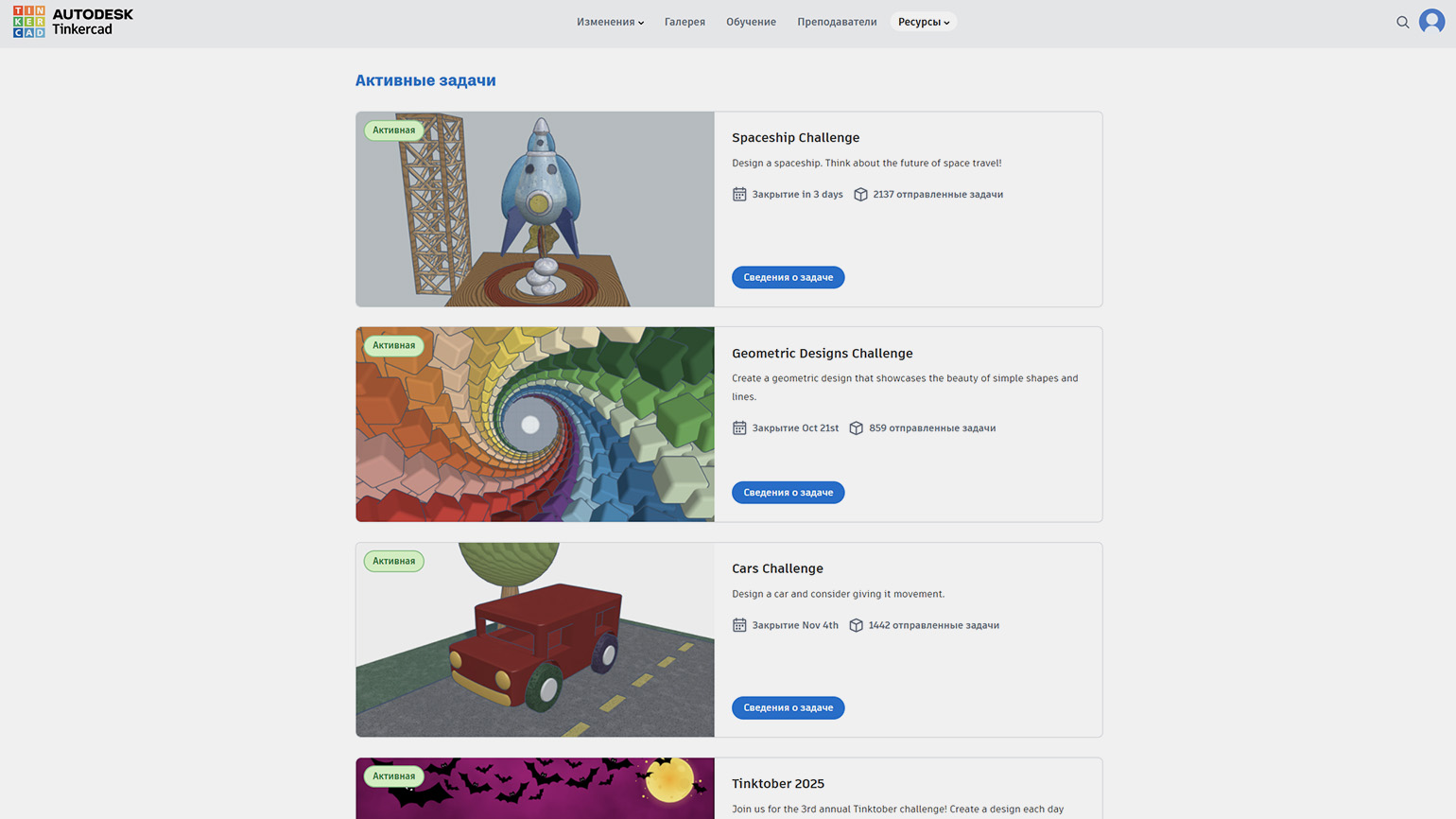 - «Ресурсы» — статьи, видеоуроки и публикации участников сообщества по работе с Tinkercad.