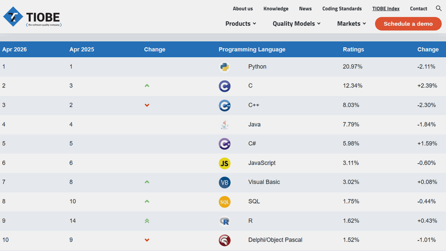 13 апреля 2026 года Пол Янсен опубликовал индекс TIOBE за апрель. По сравнению с прошлым годом первая десятка почти не изменилась, и в тройке лидеров — Python, C и C++. Если говорить о перестановках, то R поднялся с десятого на девятое место, Delphi/Object Pascal вошёл в десятку, а Perl из неё выпал.