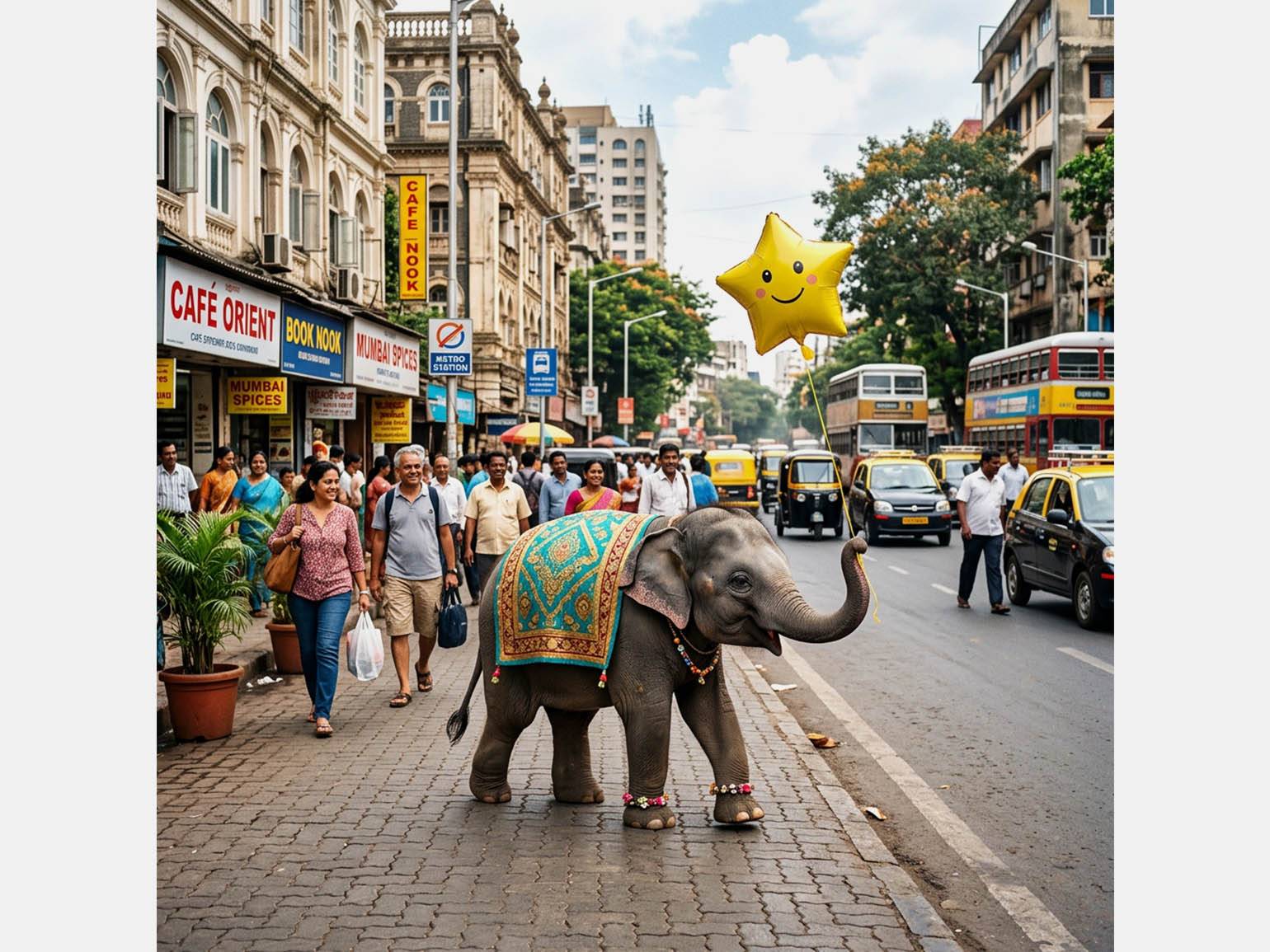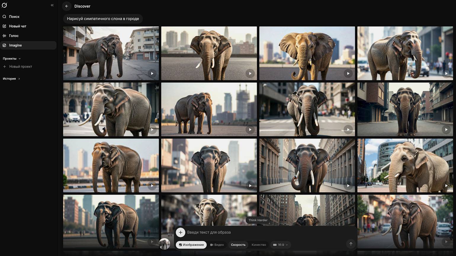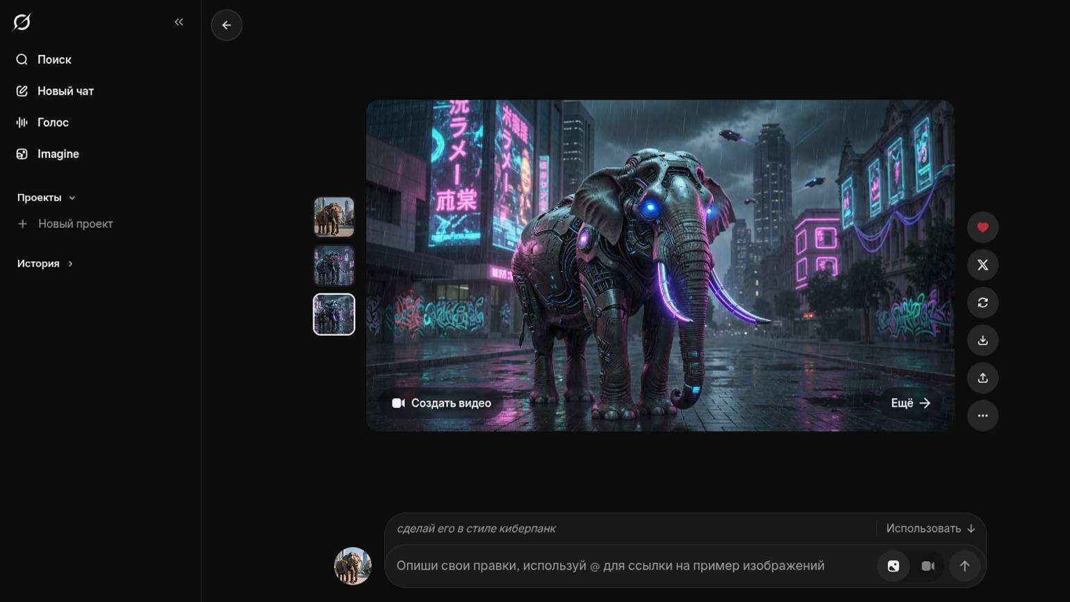 Со второго запроса Grok уже выдал фотореалистичные изображения: мы получили несколько десятков вариантов слона на фоне городских улиц. Любой результат можно доработать — повысить качество, изменить соотношение сторон, добавить референсы и уточнить правки текстом. Например, ради эксперимента мы переделали одну из иллюстраций в эстетике киберпанка.