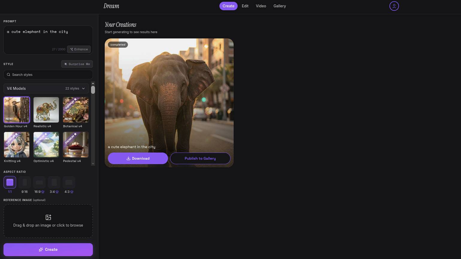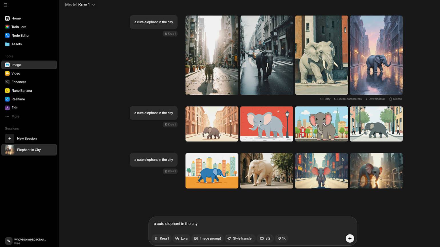 Krea AI — платформа‑агрегатор, которая объединяет популярные ИИ‑модели для создания и редактирования изображений, видео и 3D‑объектов. Сервис работает в браузере и рассчитан на англоязычную аудиторию, поэтому для более точных результатов промпты лучше переводить с русского на английский. В нашем случае запрос будет таким: «A cute elephant in the city».