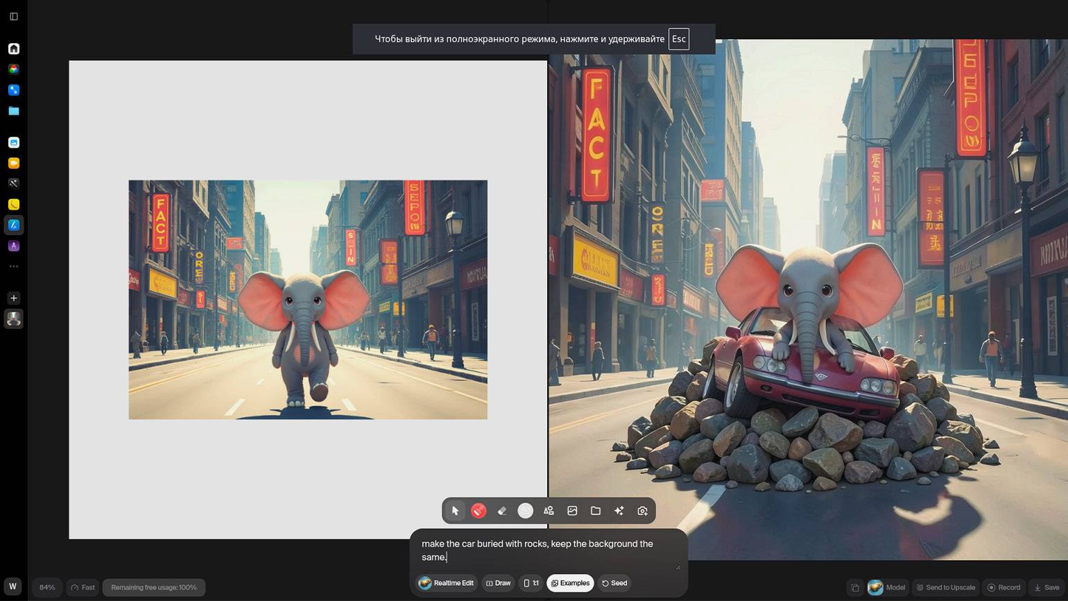 Одна из интересных возможностей сервиса — режим Realtime, в котором результат обновляется мгновенно по мере ввода промпта или рисования. Например, мы можем взять одного из сгенерированных слонов, включить Realtime Edit и добавить запрос «Make the car buried with rocks, keep the background the same». То есть мы оставили фон без изменений и добавили машину, засыпанную камнями, — и она неплохо вписалась в текущий рисунок.