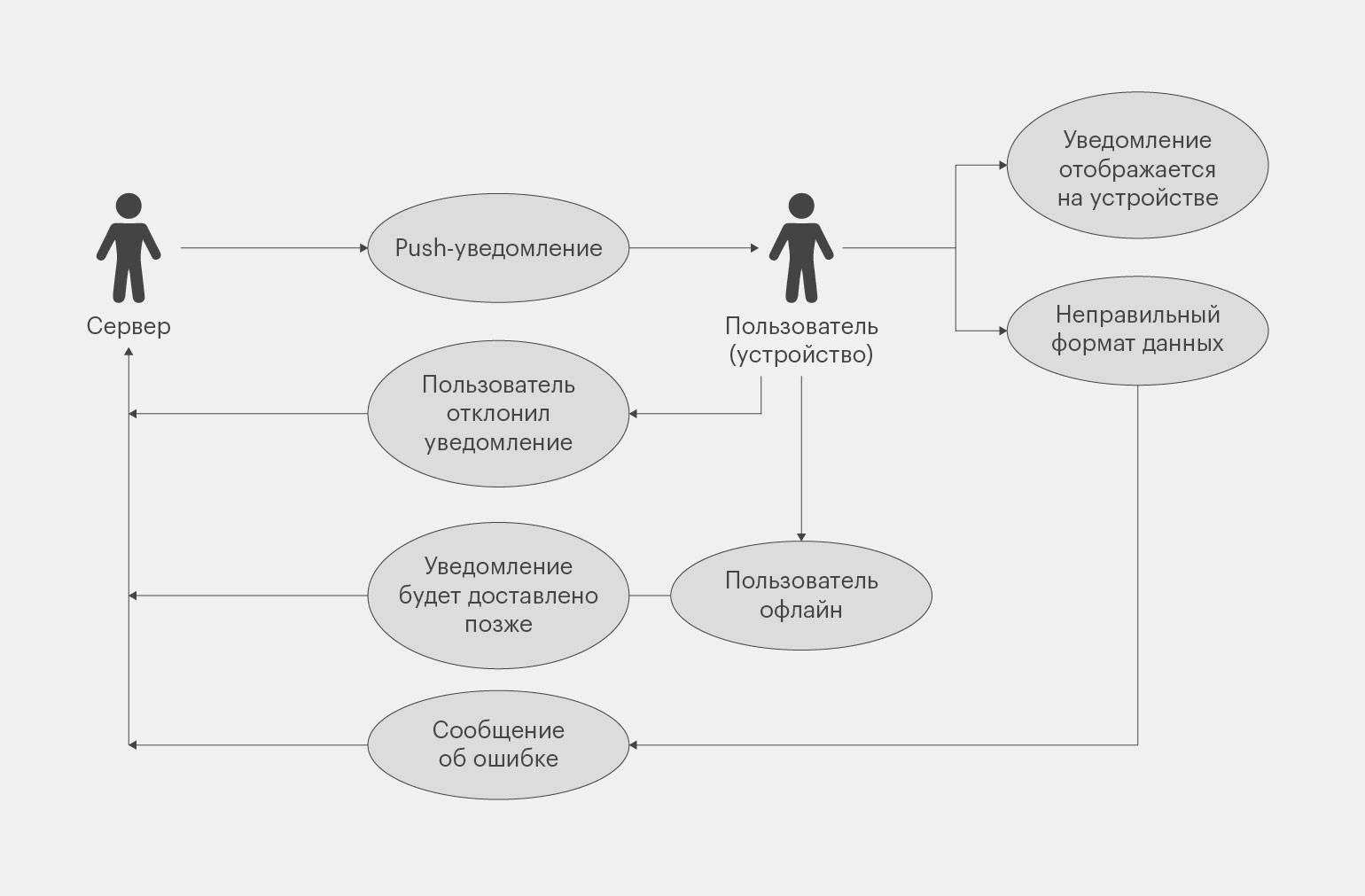 - Если пользователь отключил уведомления, то устройство не получает уведомление. Возможно, ПО будет логировать то, что уведомление отправлено, но не доставлено.