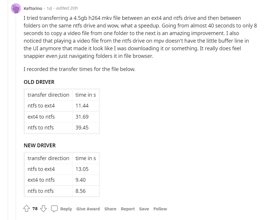Со старым драйвером файл передавался между папками 40 секунд, с новым — 8. Я заметил, что при воспроизведении файла с NTFS-диска пропала буферизация. Заметно ускорилась навигация в файловом менеджере.