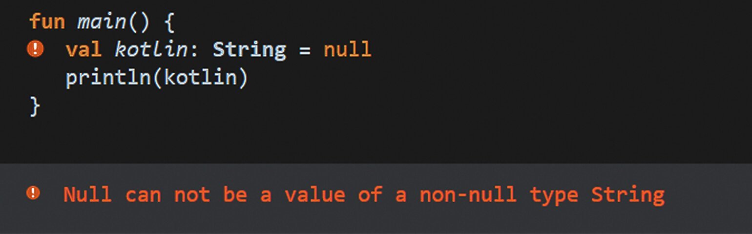 В больших и сложных проектах поиск строки с ошибкой может занять много времени и сильно потрепать нервы. В Kotlin такой проблемы нет, потому что все переменные по умолчанию не нулевые. Компилятор сразу перестанет собирать проект, если значение какой-то строки равно нулю, и ошибка не вылезет в готовой программе.