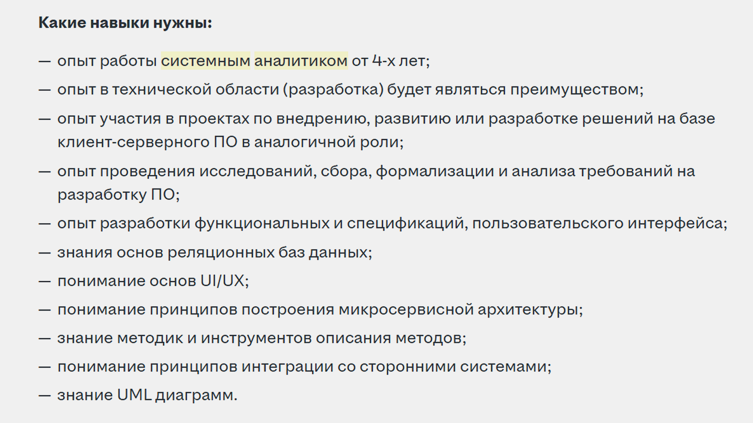 У системного аналитика уровня middle должен быть опыт работы с внешними и внутренними сервисами. Кроме того, надо уметь проектировать API, составлять спецификации и описывать бизнес-логику. Компании ожидают, что специалисты такого уровня будут согласовывать решения с архитекторами ПО и разработчиками.