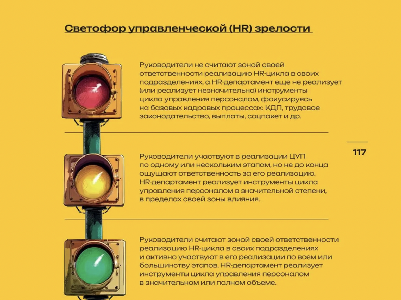 Приступив к рассказу о формировании системы обучения, авторы вводят термин «Светофор управленческой зрелости» — это модель, которая делит компании на три категории (они соответствуют красному, жёлтому и зелёному сигналам светофора) по тому, насколько осознанно и ответственно они работают с кадрами.