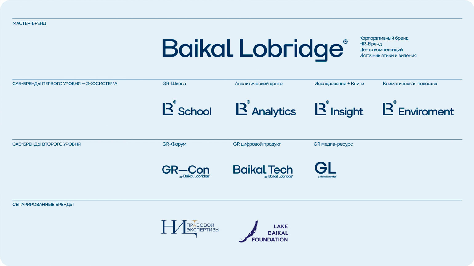 Baikal Communications Group переименовали в Baikal Lobridge. Слово «Baikal» сохранили ради преемственности и узнаваемости, а слово «Lobridge» (от «lobby» и «bridge») прямо описывает функцию компании — соединять интересы бизнеса и государства. Название одинаково понятно и для российской, и для международной аудитории.