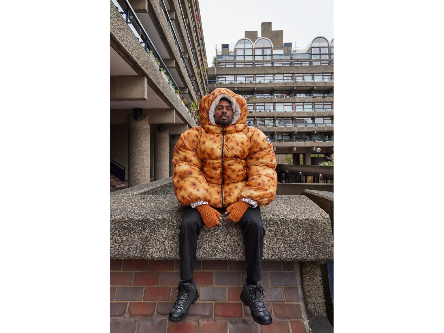 В рукава куртки вшиты выдвижные тёмные варежки с серебристыми манжетами, чтобы напоминать картошку в мундире, завёрнутую в фольгу. У пуховика ещё есть серебристый дождевик, чтобы тот, кто его носит, чувствовал себя «пропечённым».