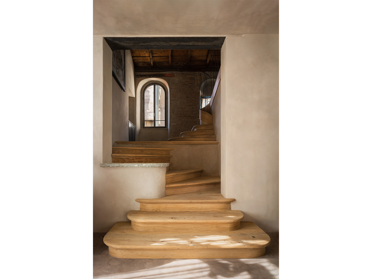 По словам Миньятти, задачей было создать «тихий баланс между временем и современностью», сохранив атмосферу творческого пространства. Архитектор работала с существующей структурой — деревянными потолочными балками, паркетом и сводчатыми нишами, — дополняя их тактильными натуральными материалами.