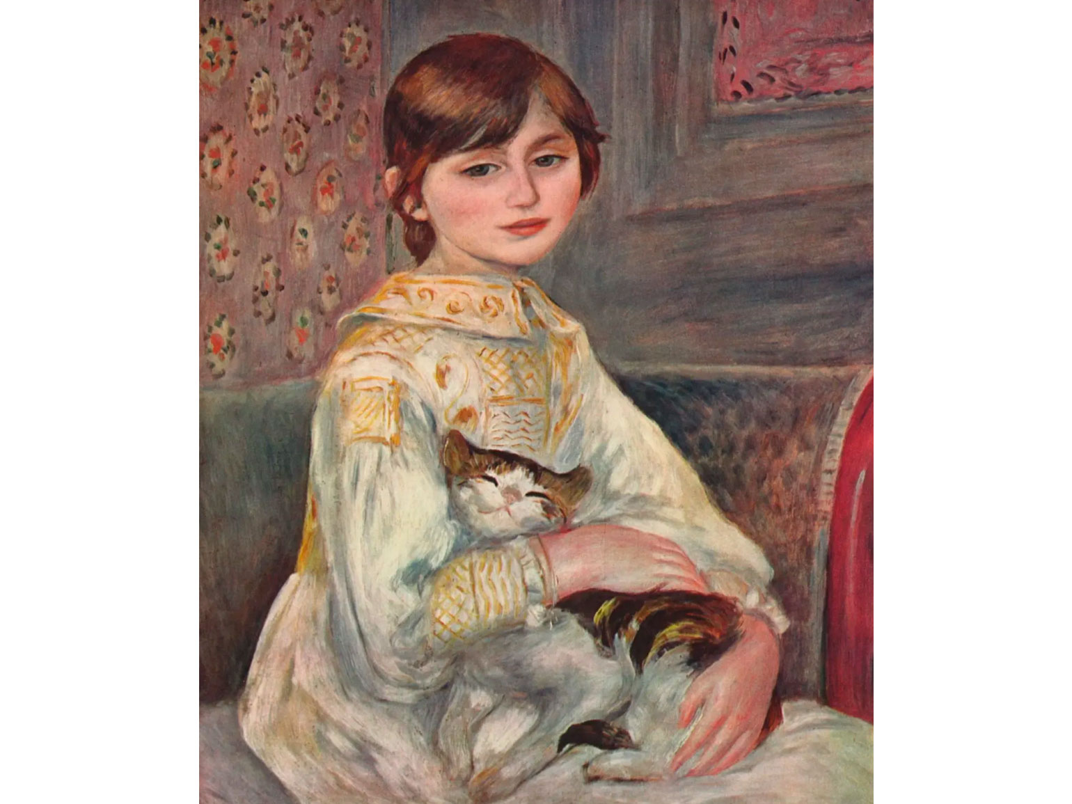 Художник изобразил девочку с кошкой на руках. Питомец будто бы улыбается, жмурится от удовольствия быть со своей маленькой хозяйкой. К кошачьим Ренуар питал особую любовь — на многих его портретах присутствуют кошки. Эти животные были с ним и в конце жизни. В период борьбы с артритом они согревали и лечили художника, а их шерсть на полотнах помогла датировать картины при проверке на подлинность.