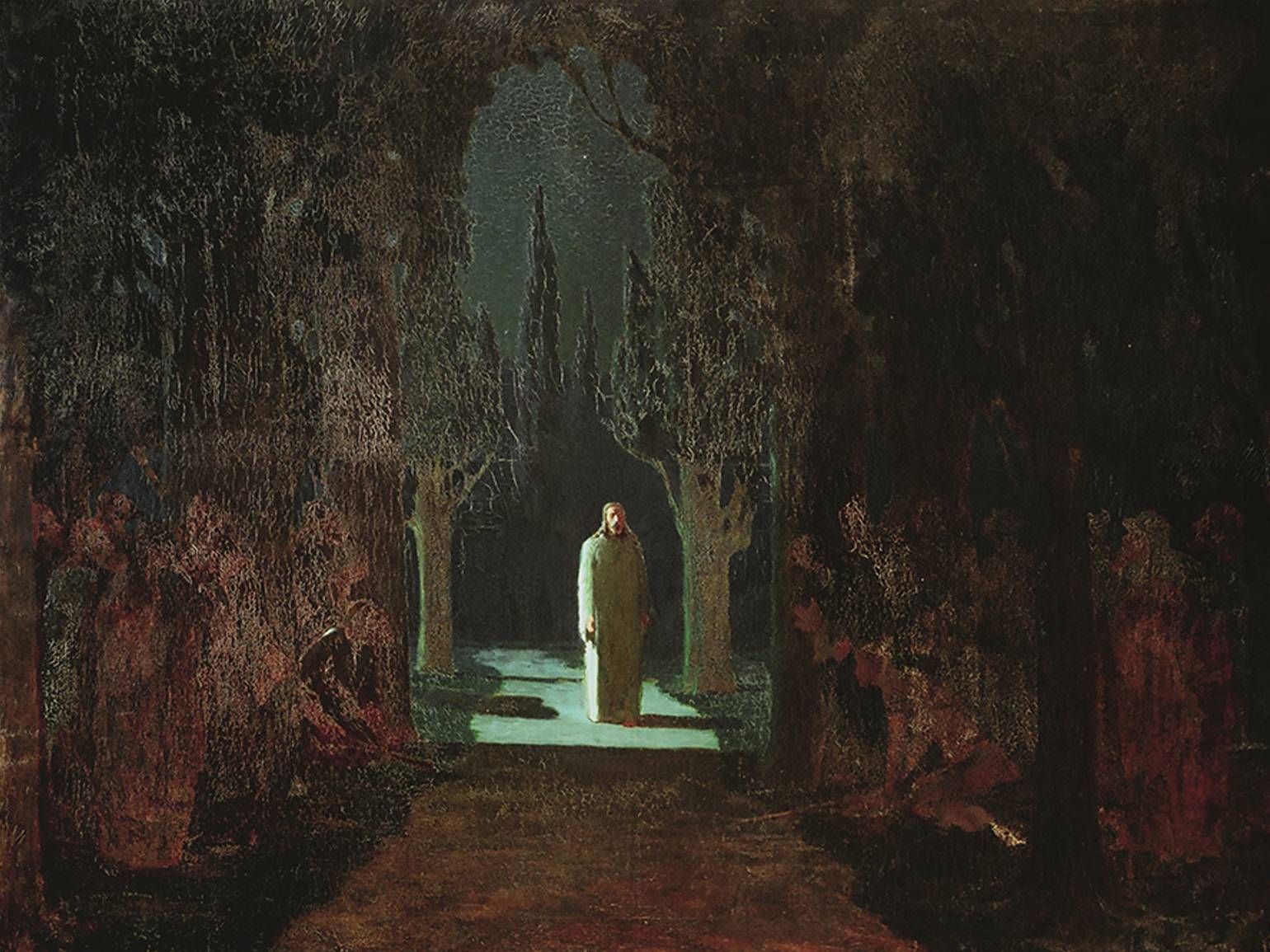 Библейский сюжет: после Тайной вечери Иисуса с двенадцатью учениками, где он рассказал им о судьбе, которая ожидает его, они отправились на Елеонскую гору для проповеди. У её подножия в селении Гефсимания Иисус вошёл в сад, чтобы в одиночестве обратиться к Отцу с молитвой.
