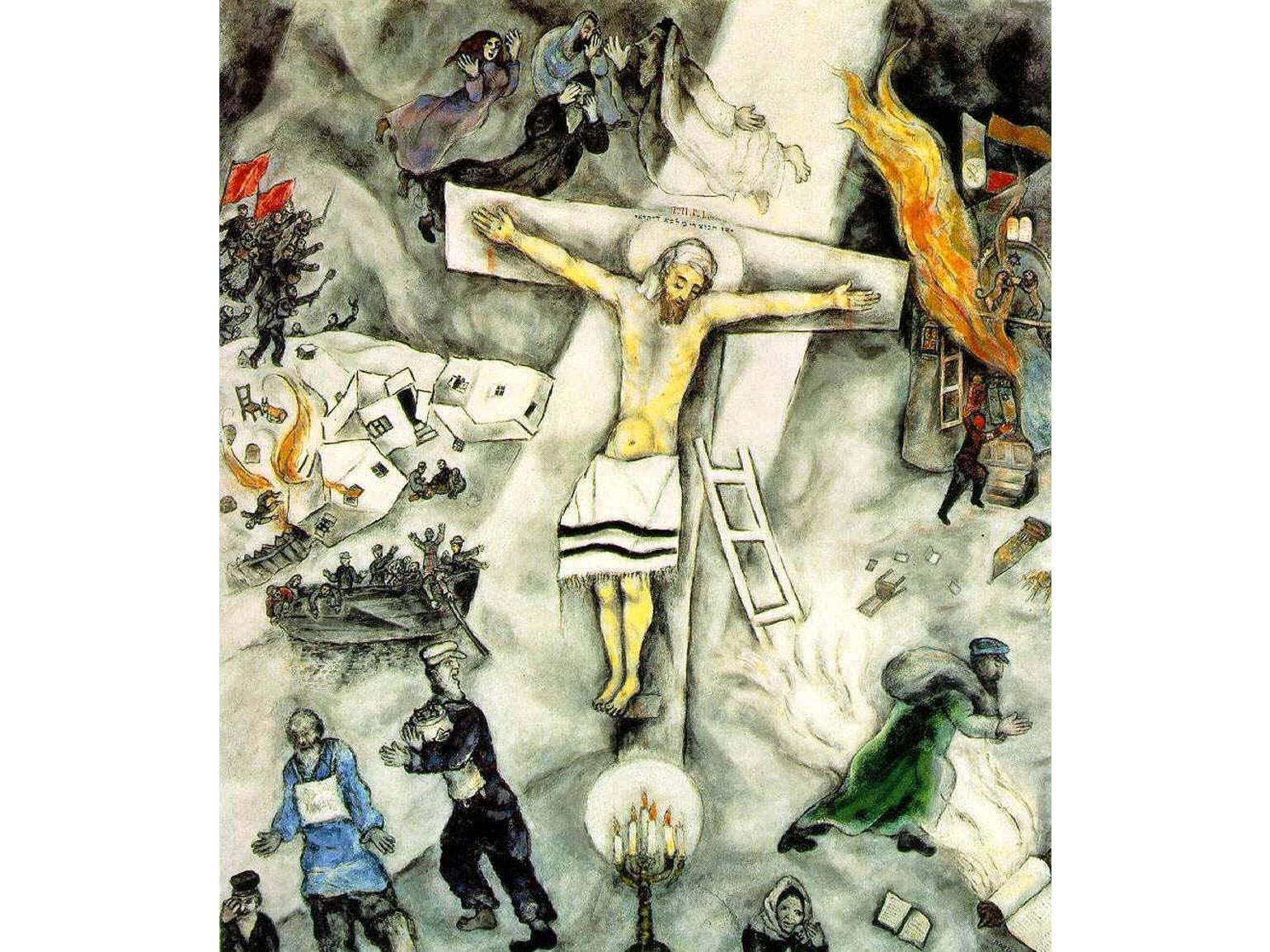 Шагал изобразил распятие Иисуса не по новозаветному канону. Крест и пригвождённый Христос в талесе и с менорой в ногах — в центр картины с образами современной ему катастрофы, бед и страданий евреев: «Белое распятие» написано под впечатлением от событий «Хрустальной ночи» — еврейских погромов в фашистской Германии.