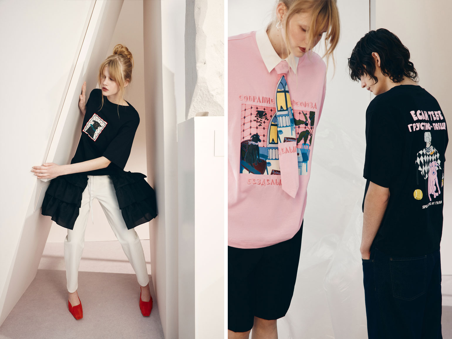 Для съемки лукбука команда создала галерею с белыми стенами и объектами из газобетона — материала, который Данил Дэге часто использует в своих работах. Стилисты сочетали вещи с принтами с денимом, клеткой, спортивными элементами и пайетками, чтобы модели стали похожи на посетителей петербургских галерей.
