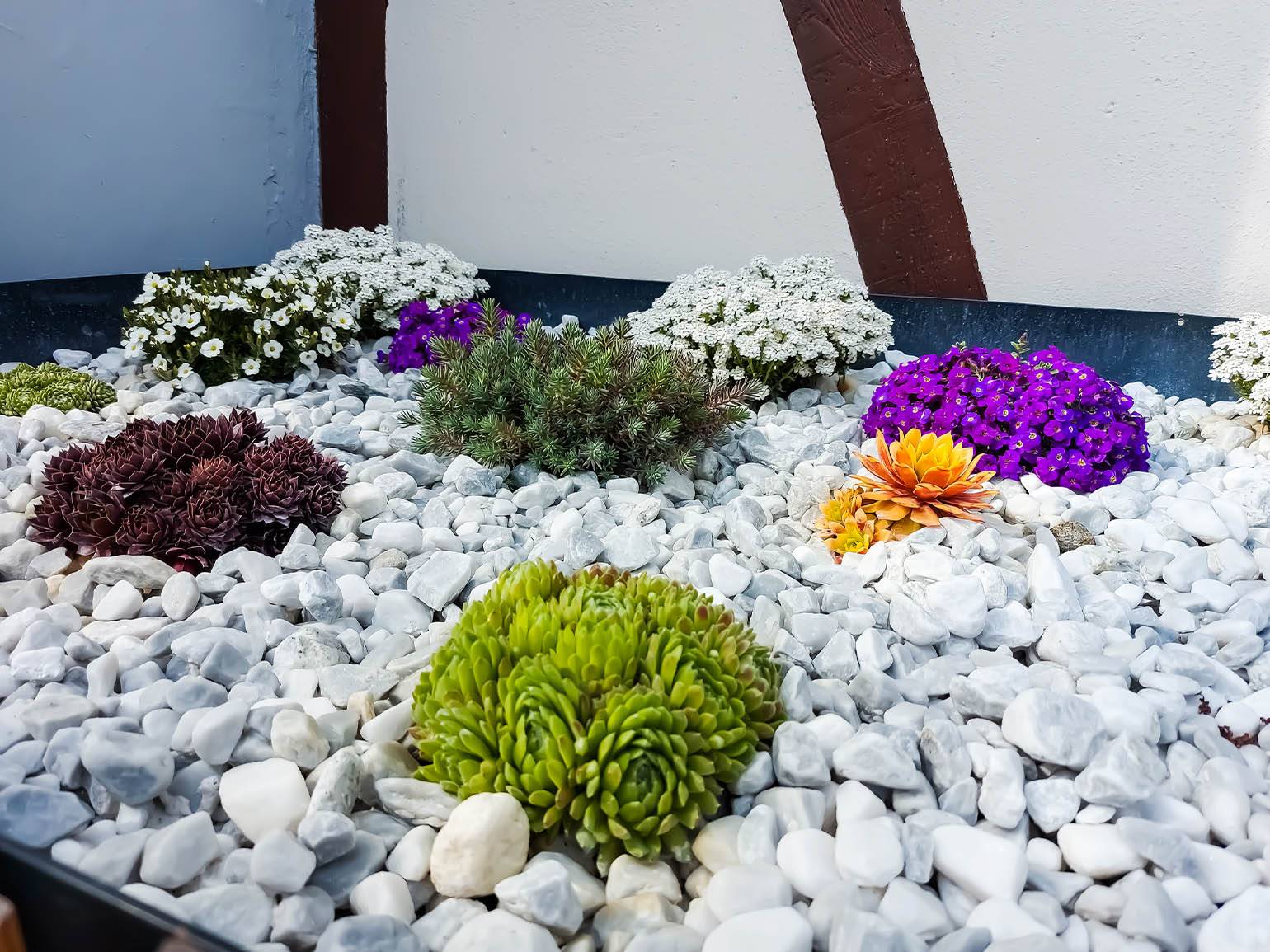 Многие используют простой острый известняковый щебень или гранитную крошку с острыми краями. Проблема в том, что строительный щебень со временем слёживается в монолит, в нём плохо дышат корни, а острые углы травмируют стелющиеся растения. К тому же на нём быстро растут сорняки, которые невозможно выполоть, не перекопав весь камень. Лучше использовать окатанную гальку или гравий с округлыми формами — он лучше пропускает воздух и выглядит естественнее.