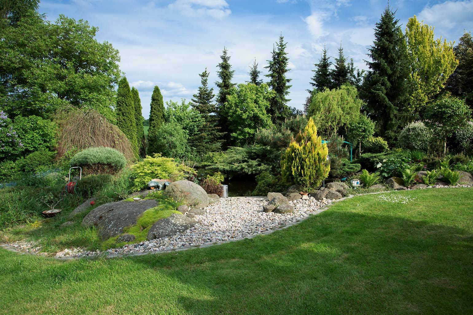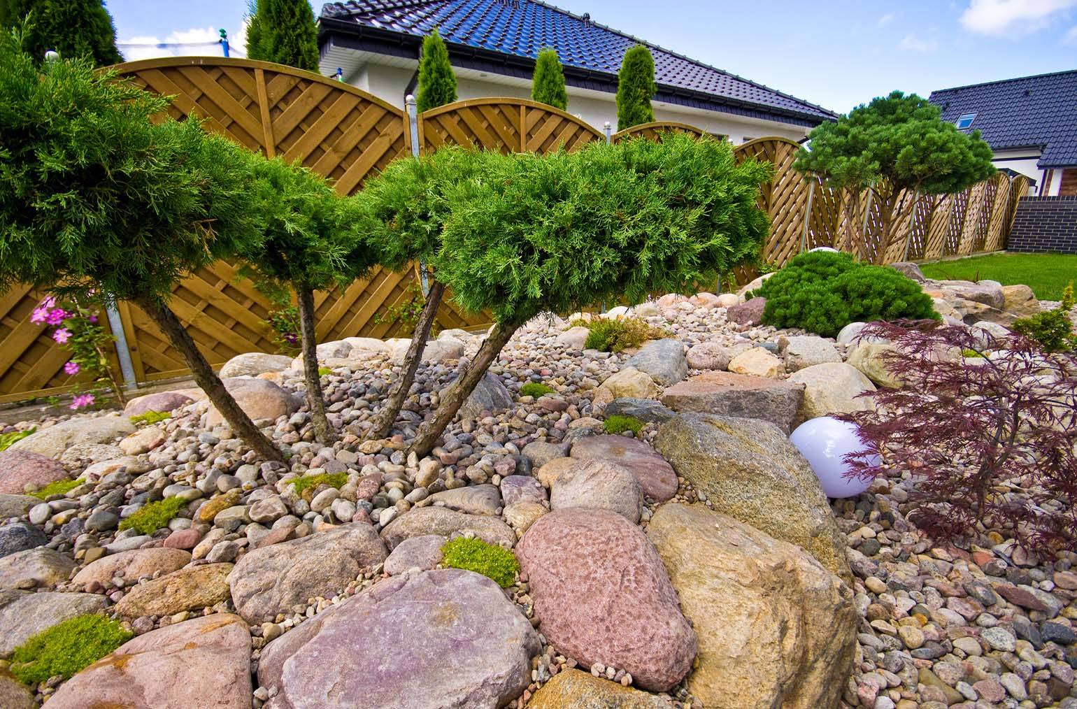 Выбор рокария зависит и от рельефа участка: на крутом склоне подойдёт горный тип с крупными валунами и хвойными растениями, на холме, например, террасный тип с утопленными камнями, тропинками и почвопокровными растениями, а на ровной поверхности — ландшафтный, с акцентом на зелени между валунами.