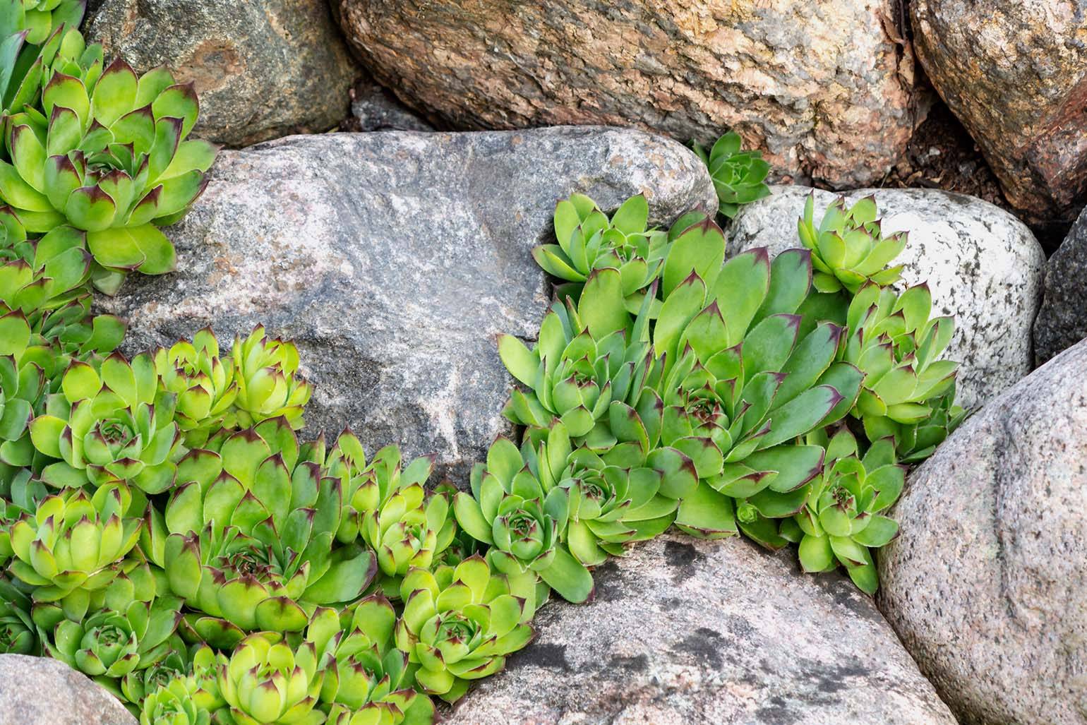 - Молодило, или каменная роза, — создано для рокариев. Аккуратной формы, совершенно не требовательное к почве, прекрасно переносит засуху и морозы. В дикой природе растёт между скал, хорошо смотрится среди пористого туфа или песчаника.