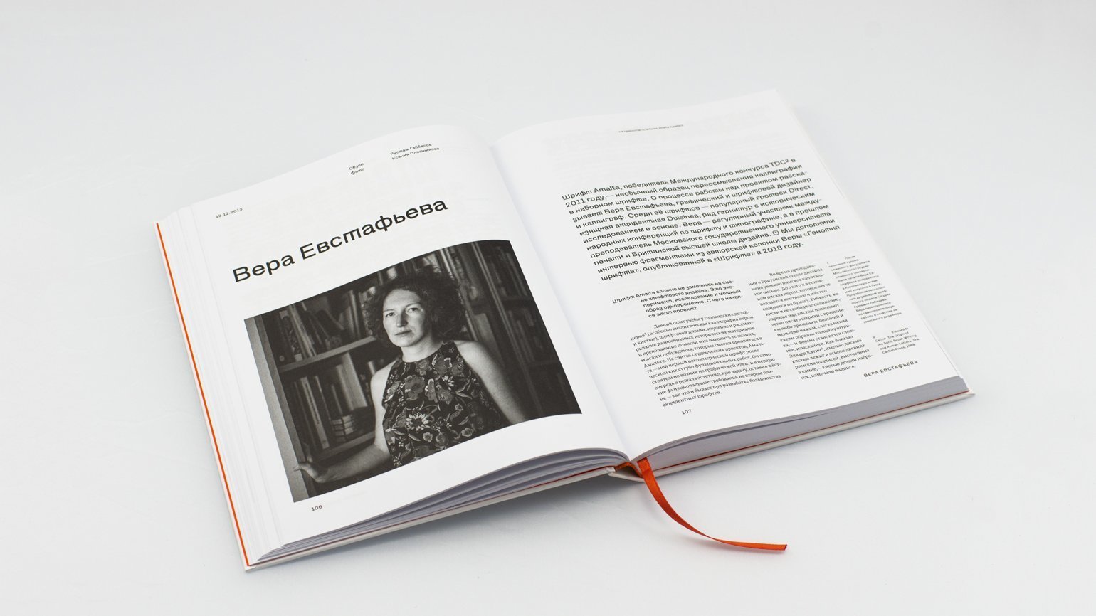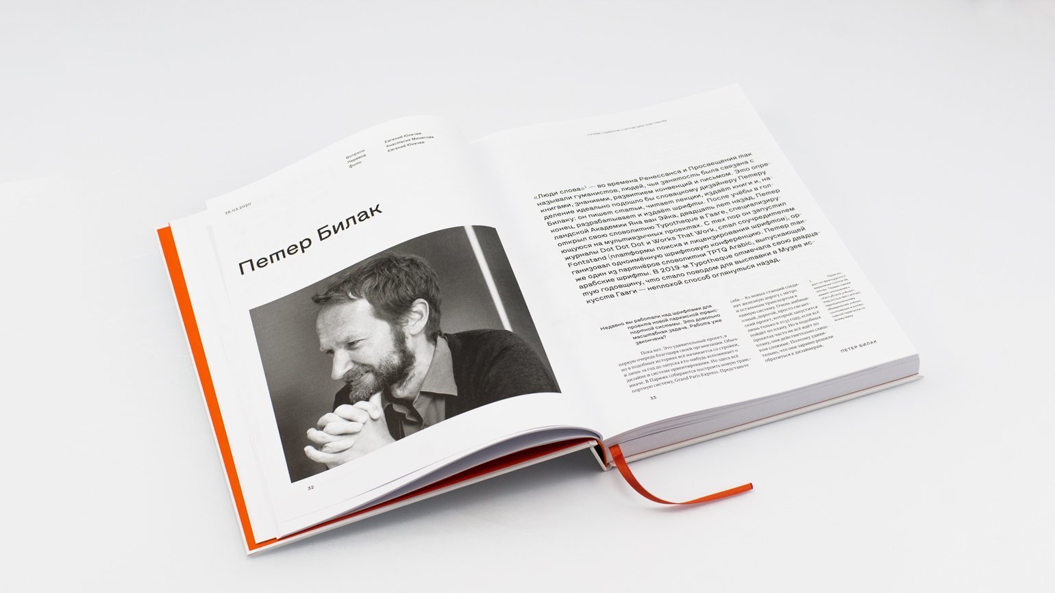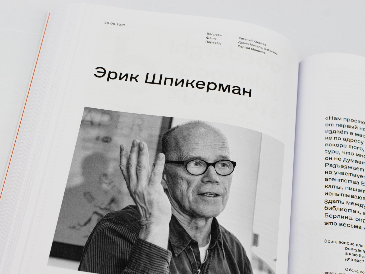 «Нам хотелось подстраивать вёрстку текста и иллюстраций под характер бесед. Все герои разные, со своим неповторимым темпераментом, темпом речи. Иллюстрации тоже были разномастными: образцы шрифтов, каллиграфия, фотографии, графика, даже скриншоты. Нужна была сетка, которая позволяла бы расставлять эти неоднородные пятна по страницам без жёсткого диктата по ширинам, с возможностью вариаций, но числом не больше трёх».
