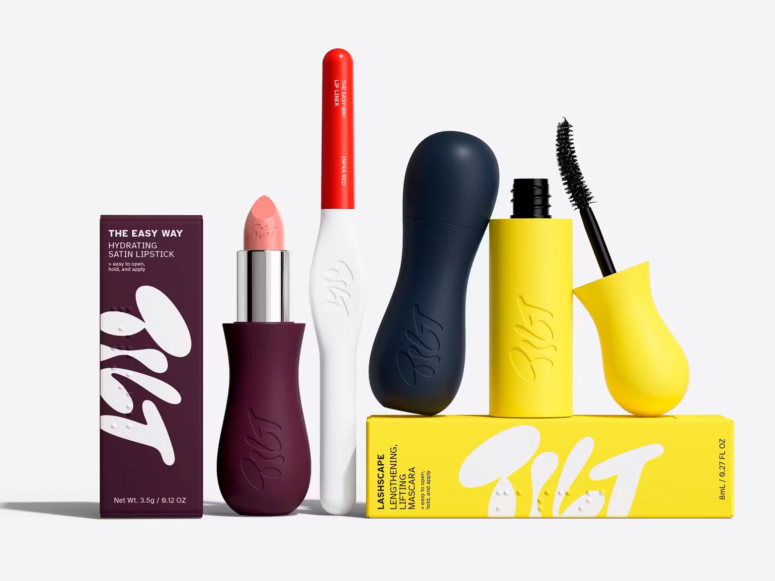 Основная упаковка покрыта силиконом, который в сочетании с изогнутыми формами призван помочь людям с ослабленной хваткой. Щёточка для туши короче стандартной, так как исследования показали, что людям с дрожащими руками трудно пользоваться более длинными щеточками. Корпус содержит магниты, чтобы было легче открывать или закрывать продукты. Вторичная упаковка имеет большие отрывные полоски для удобства, а текст набран шрифтом Atkinson Hyper-Legible от Braille Institute of America. Ещё есть описания продуктов шрифтом Брайля.