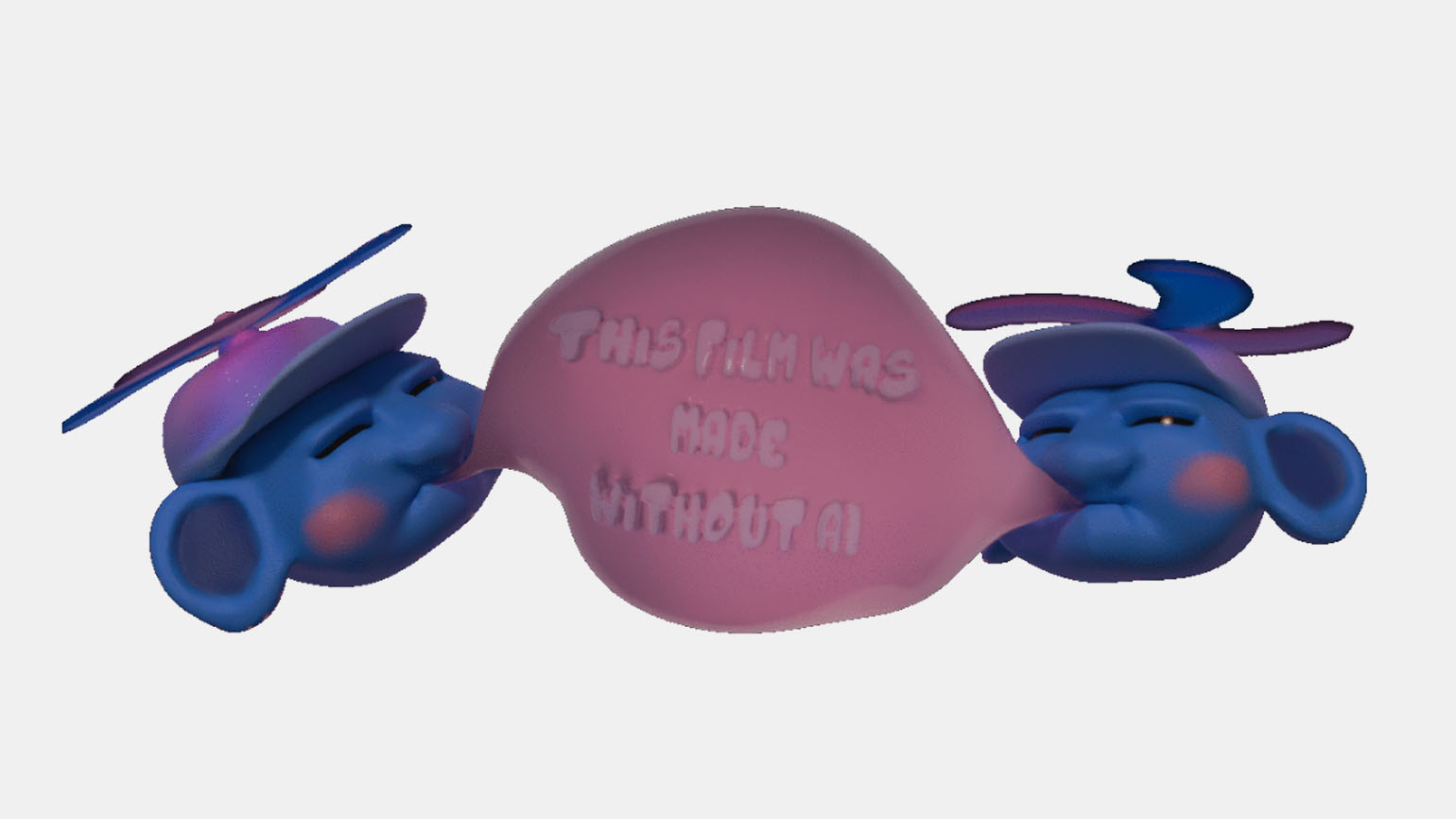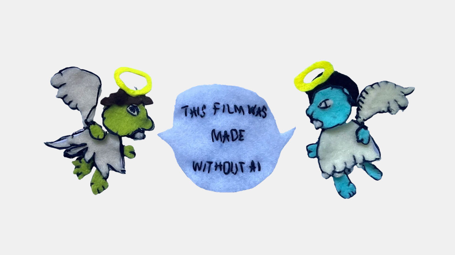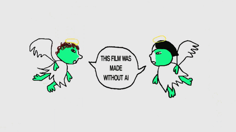 Проект — это онлайн-платформа с анимированными дисклеймерами, которые авторы могут использовать в своих работах. За основу взяли шаблон с двумя зелёными ангелами и надписью «this film was made without AI», однако участники интерпретируют его по-разному. На сайте уже собрано более 100 работ — от вариаций с тканью, бумагой и краской до 3D-персонажей и абсурдных образов вроде летающих лиц или курящих лягушек с крыльями.