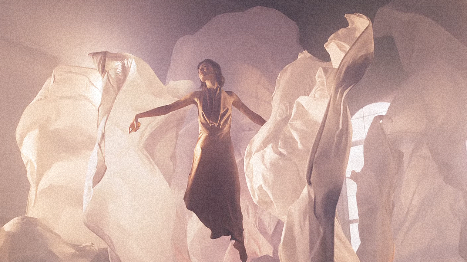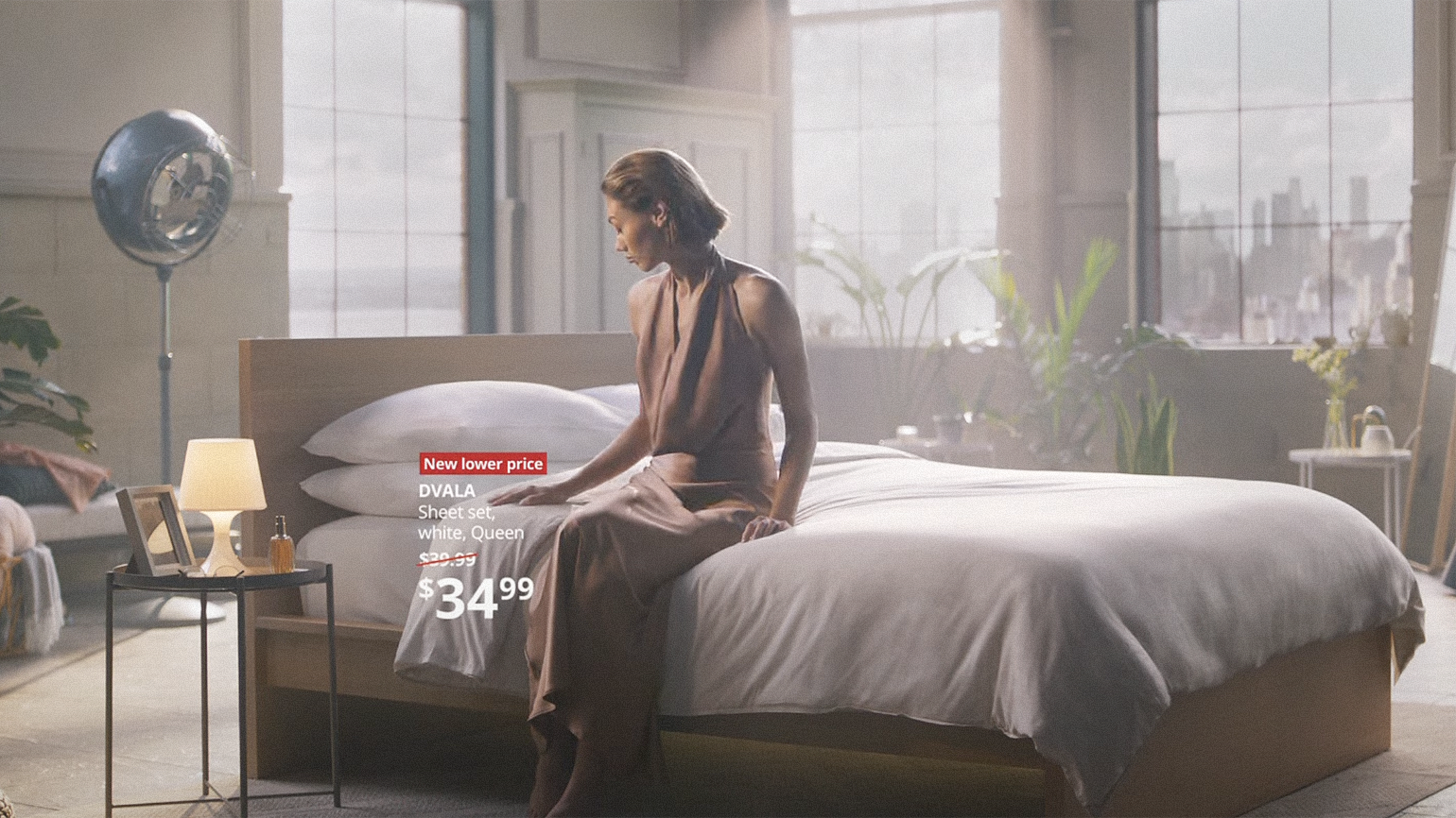 В первой рекламе женщина распыляет на себя духи, стоя в освещённой солнцем гостиной. И тут в замедленной съёмке вокруг неё начинают развеваться ткани. В конце простыни опускаются вниз, и оказывается, что это комплект постельного белья Dvala от IKEA, который стоит 34,99 доллара.