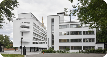 В 1925–1926 годах Вальтер Гропиус построил главный корпус школы. Благодаря прозрачным мастерским работа была на виду, «мост» соединял административные и учебные части, актовый зал и столовая меняли функции с помощью перегородок, а башня-общежитие решала проблему компактного студенческого быта. Кампус выражал принципы открытости, стандартизации и связи обучения с производством.