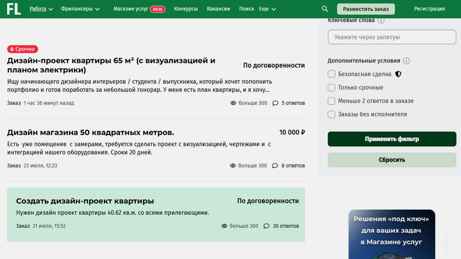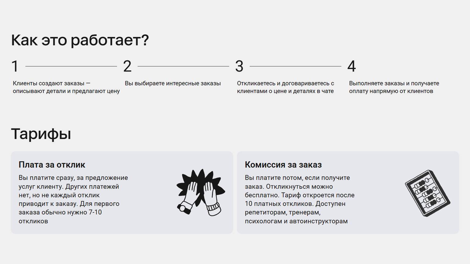 Это крупная платформа фриланса, где можно размещать анкеты и откликаться на запросы заказчиков. Клиенты сами создают заявки, вы находите подходящую и отправляете своё предложение.