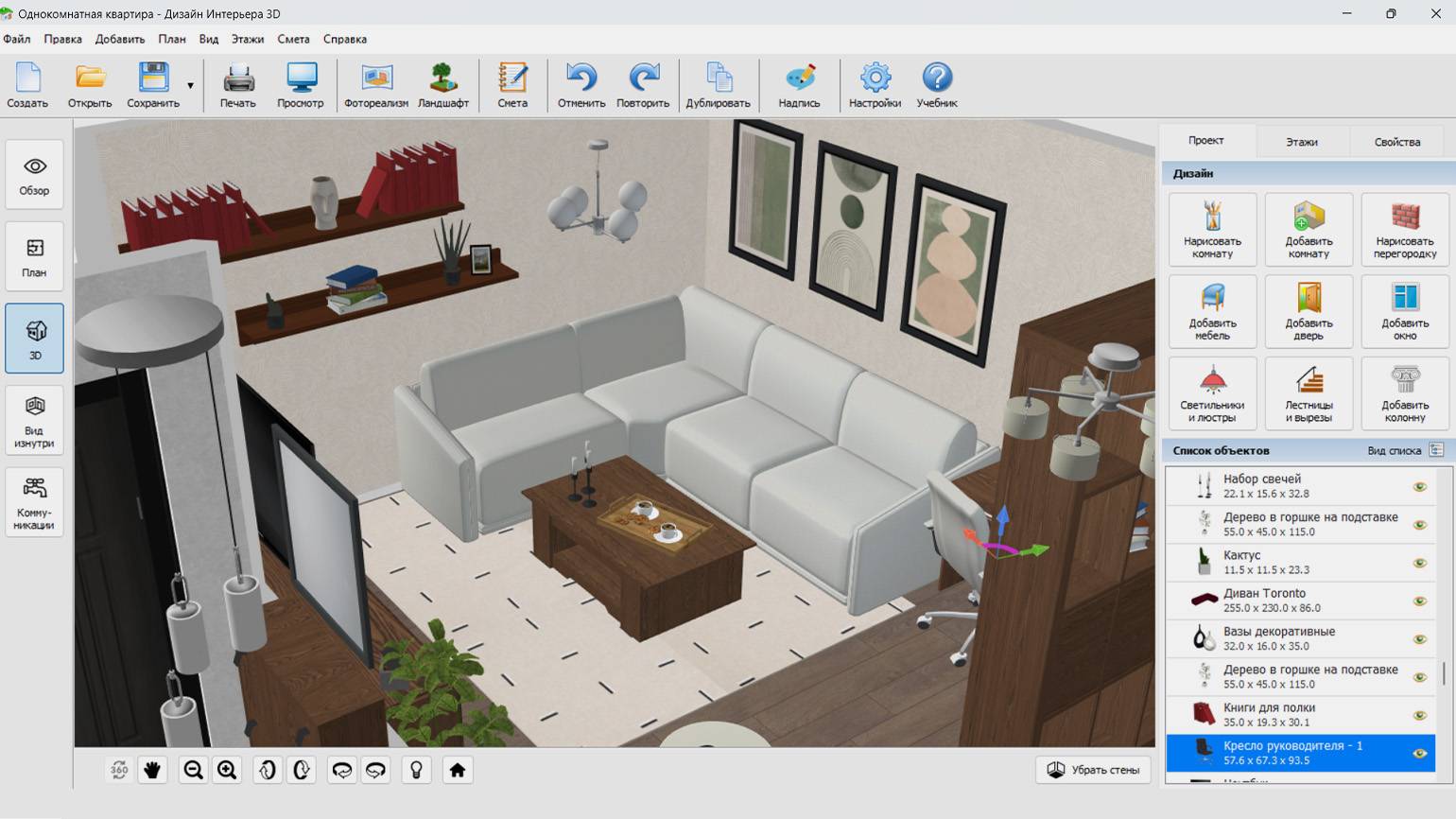 Набить руку можно, например, в «Дизайне Интерьера 3D». Софт позволяет значительно ускорить работу, так как все интерьеры создаются из готовых моделей. Размеры и дизайн всех объектов можно менять.