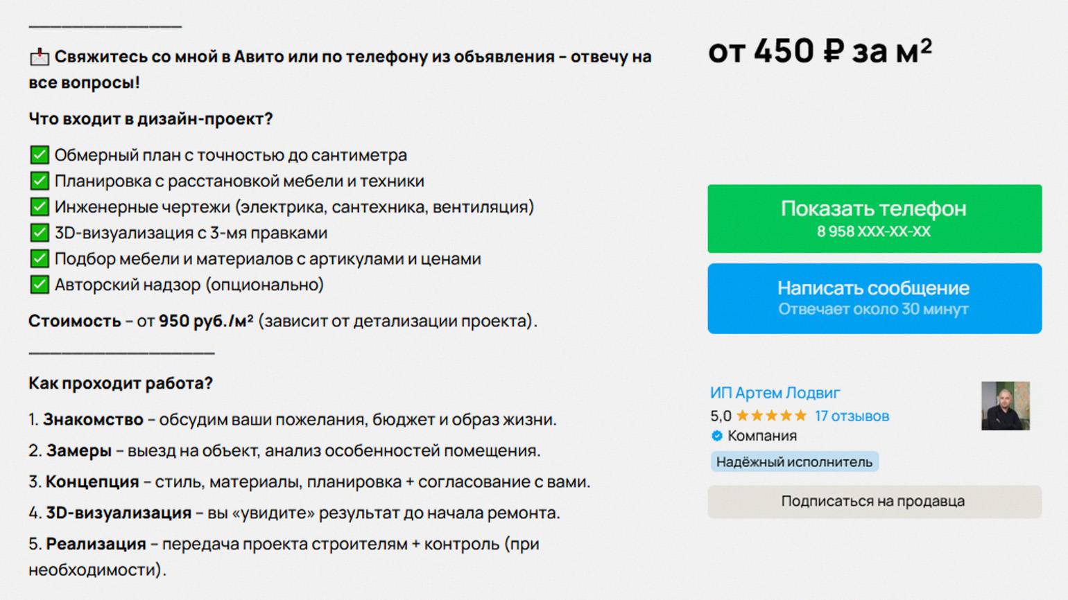 — При создании профиля на «Авито» или других сервисах не стремитесь указывать самую низкую стоимость. Адекватно оценивайте качество своей работы и плату за услуги, чтобы не трудиться в убыток себе и не выгореть в профессиональном плане.