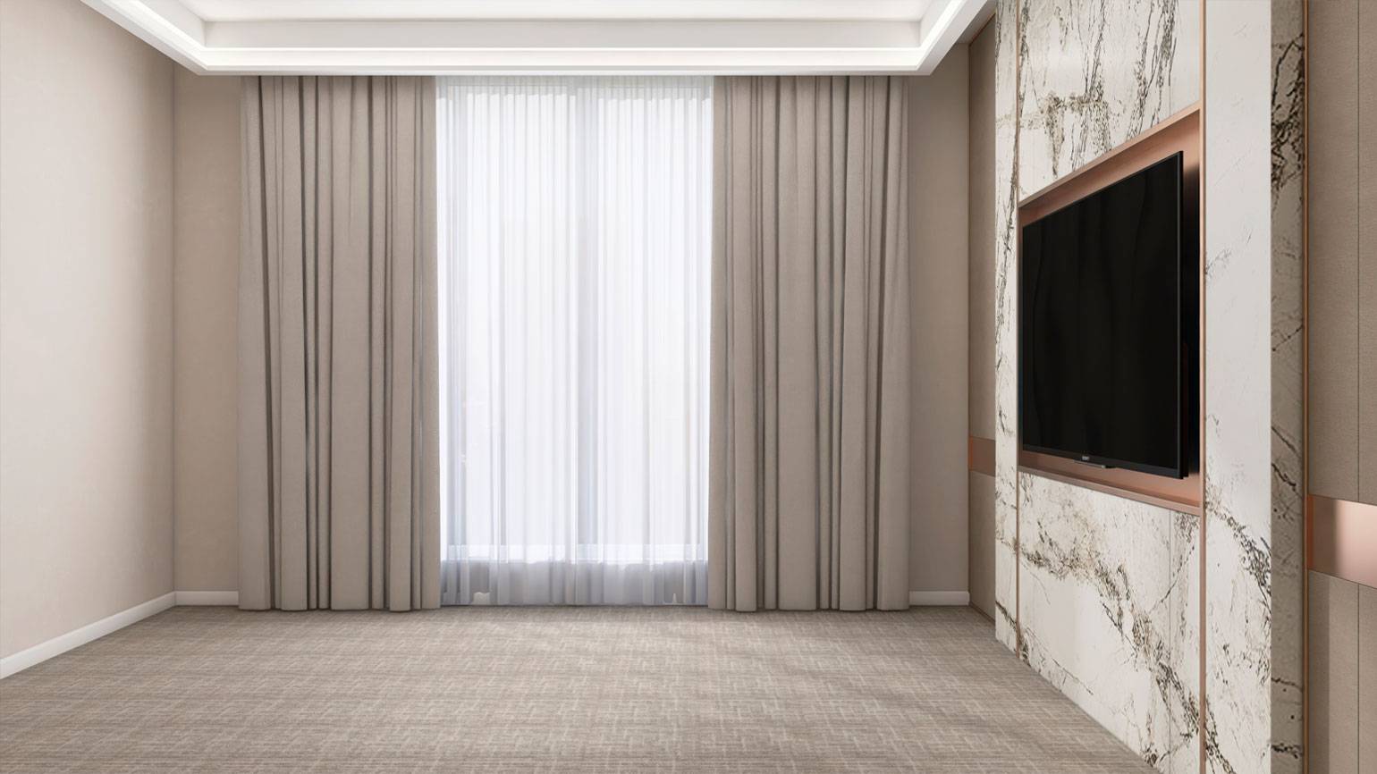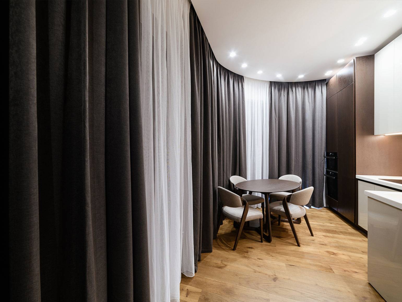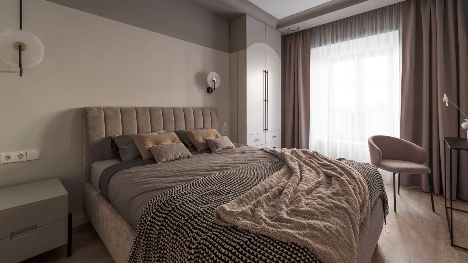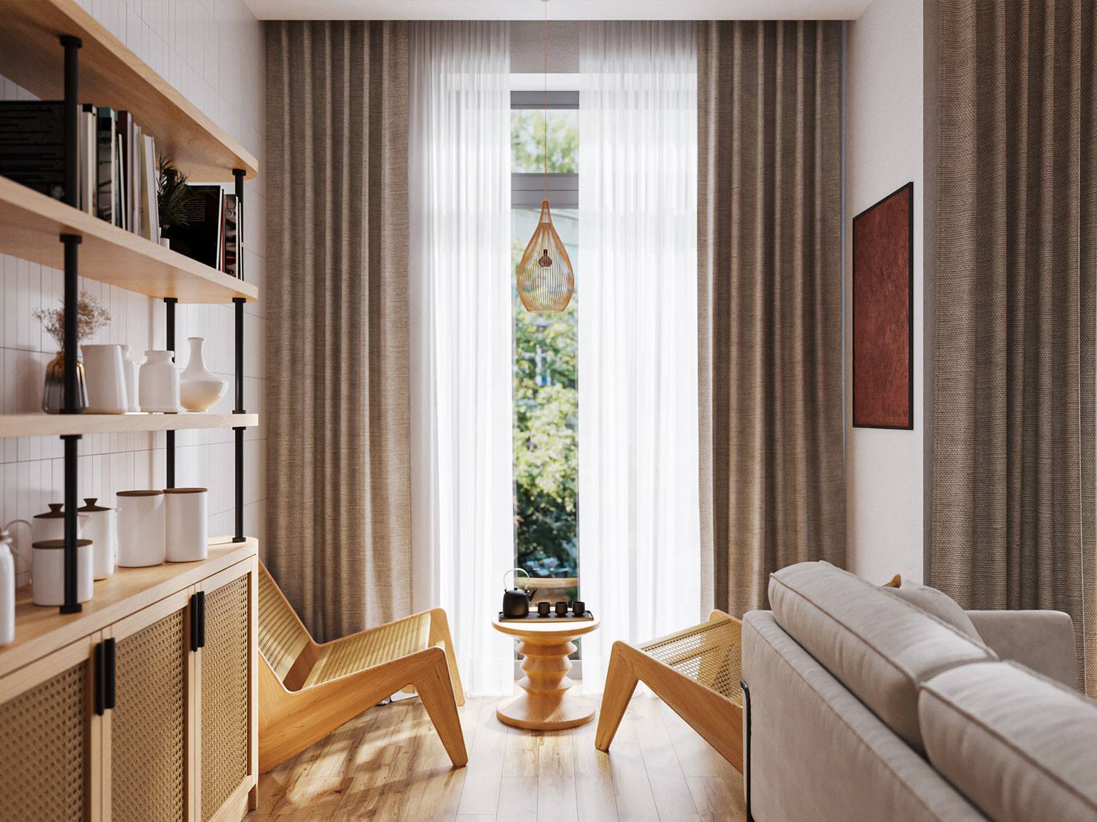 - Низкий контраст, когда шторы близки по тону к стенам, создаёт спокойный, цельный интерьер, визуально расширяет пространство и делает акцент на фактуре.