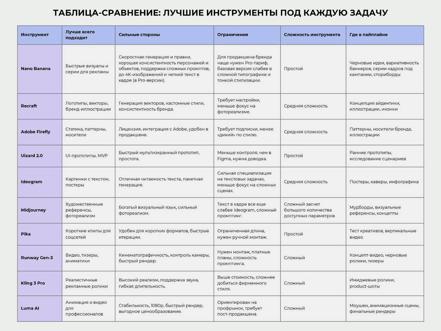Для баннеров, обложек, анимаций и A/B‑вариантов хорошо работают Nano Banana, Recraft, Pika и Runway: первые два закрывают статичный визуал и иллюстрации, вторые — динамику и видеоформаты. Плюс таких связок — быстрый цикл: идея → 5–10 вариантов → тест → доработка удачных версий.