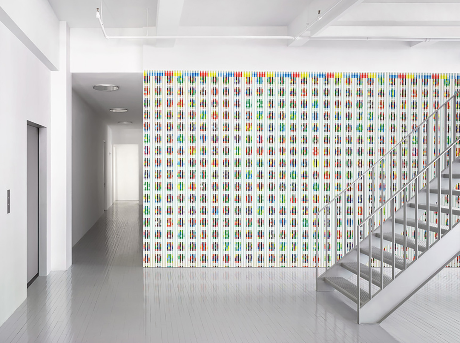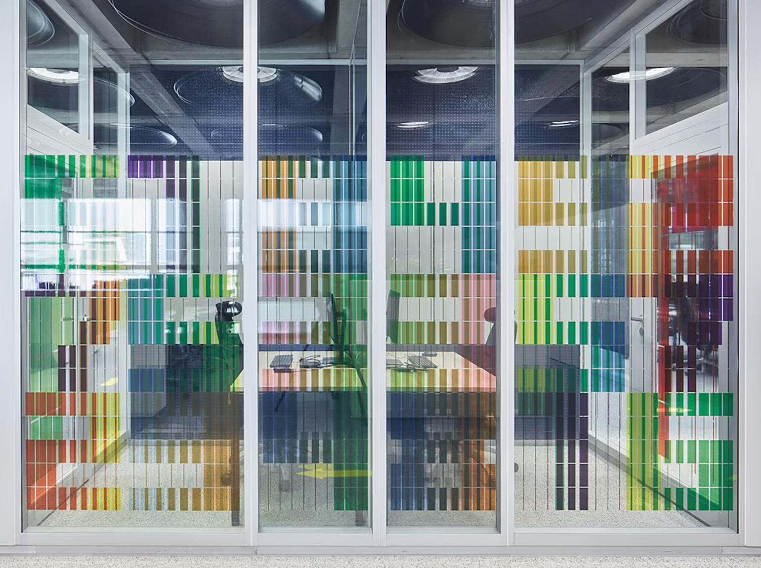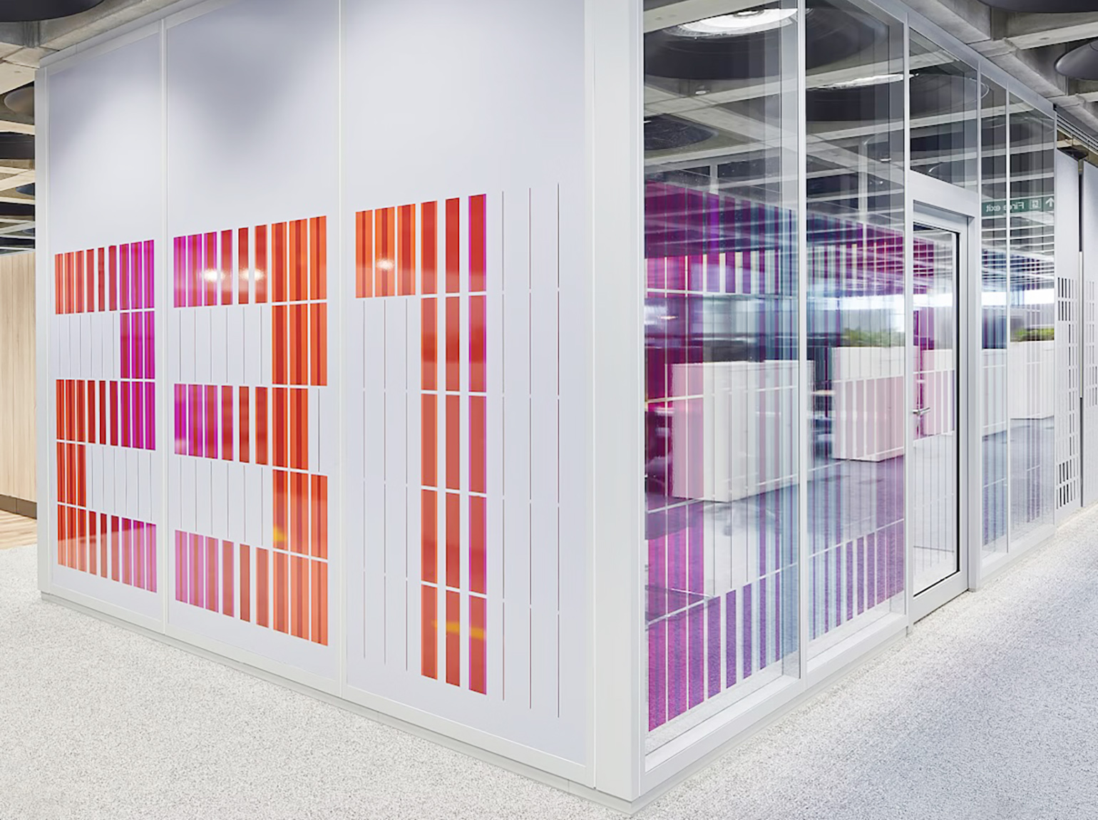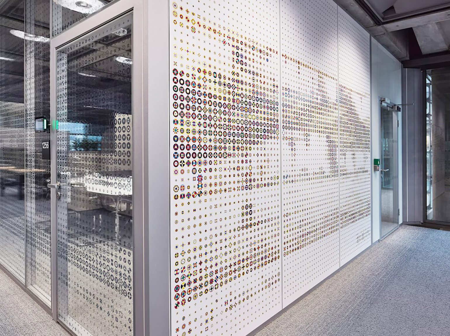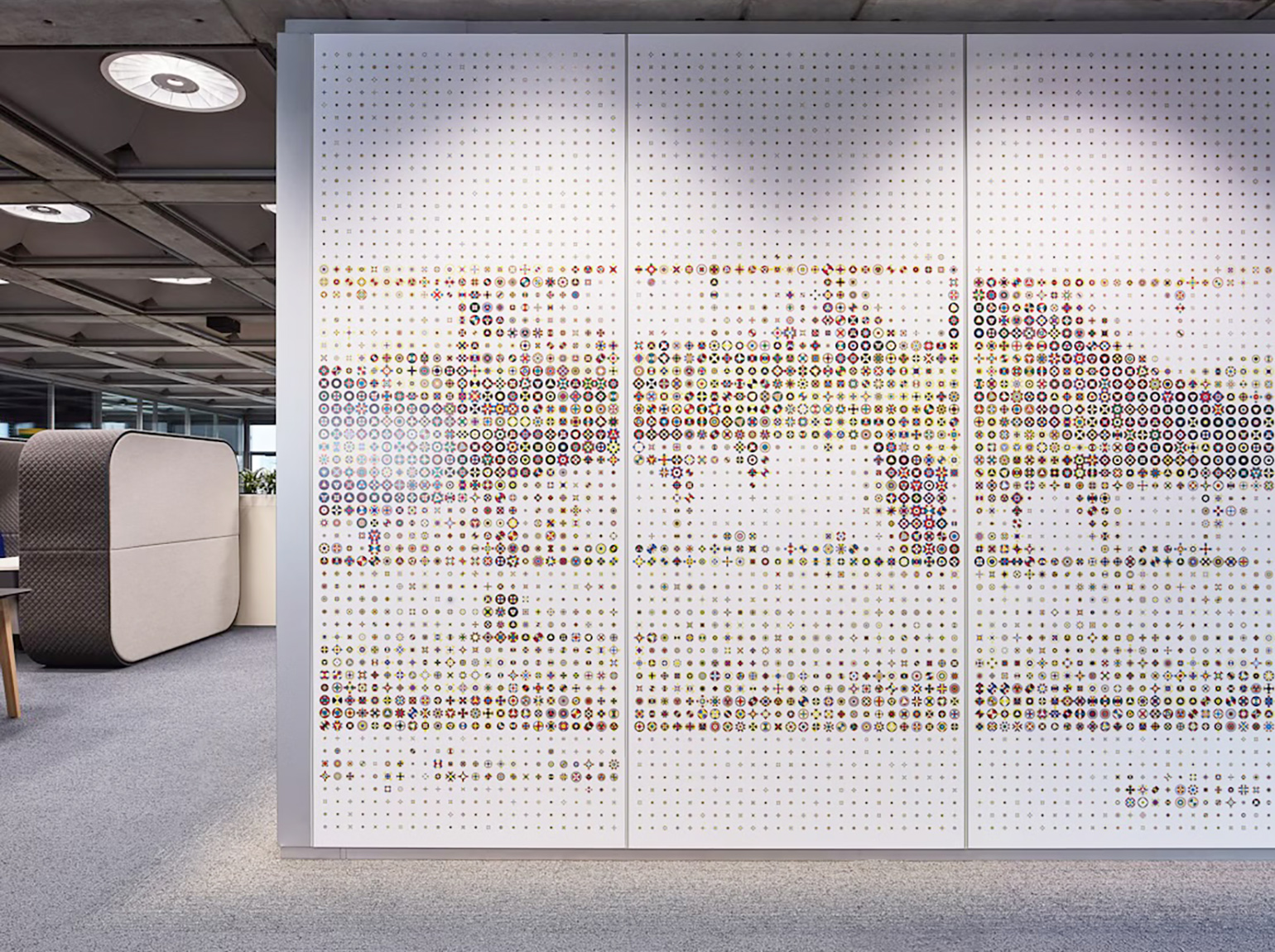 В лондонской дизайн-студии Pentagram Мартенс оформил рабочие пространства. На стеклянные панели-перегородки дизайнер нанёс изображение побережья из множества различных иконок и крупные цифры из разноцветных полос. В результате рабочие зоны выглядят светлыми и просторными, при этом сохраняют ощущение приватности.