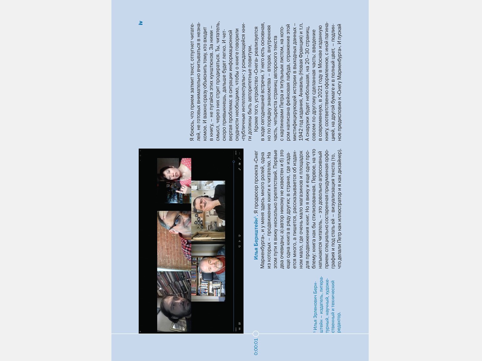 Дальше — неожиданно — «Введение», совершенно отдельное: плотная голубая бумага и текст поперёк в две колонки, ещё с какими-то синими примечаниями, с временной шкалой, с цветными картинками… Да это же запись общения издателей с читателями! То есть с кем-то, кто книгу уже прочитал; а мы собственно книги, то есть текста её, ещё и не открывали. Хорошо, попробуем почитать…