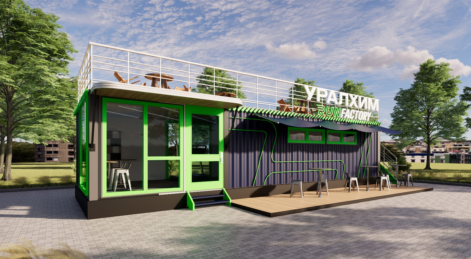 Визуализация проекта мобильного павильона, созданного из двух контейнеров. Это будущее многофункциональное пространство для бегового сообщества Уралхим Run Factory.