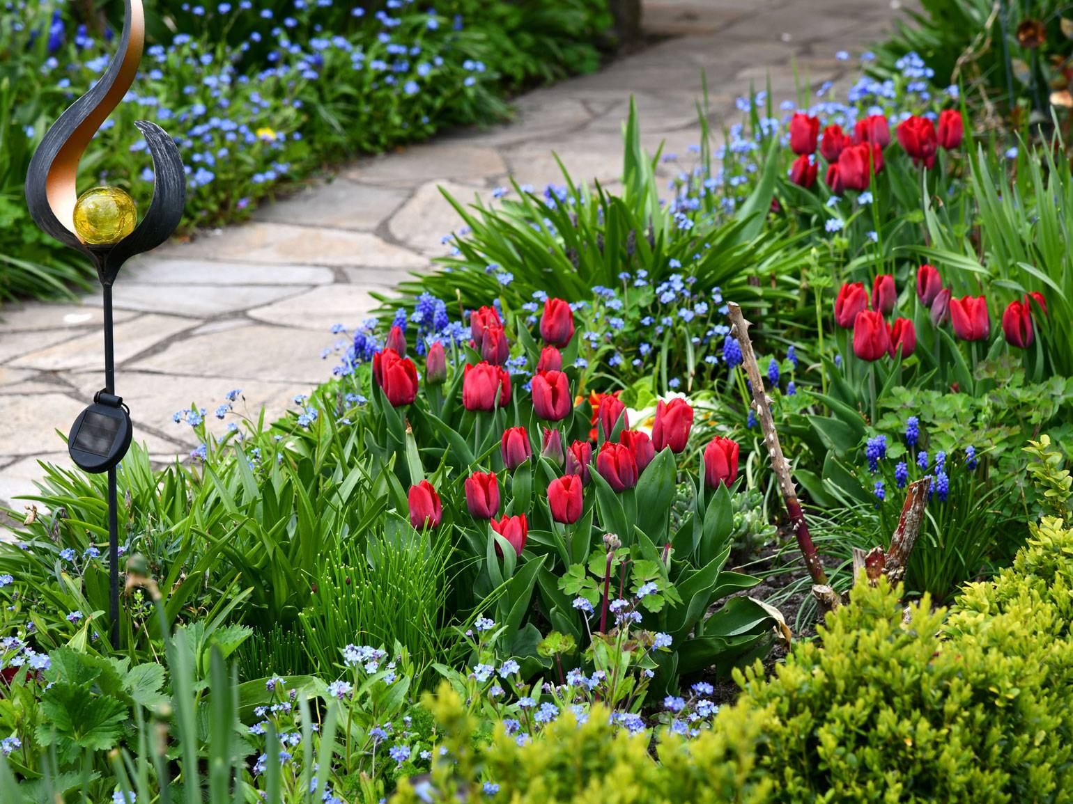 Для весны подойдут луковичные, неприхотливые первоцветы: крокусы, пролески, мускари, тюльпаны, гиацинты. Луковичные необходимо выкапывать, однако многие это правило нарушают. Через пять лет можно будет просто пересадить их в другое место. На смену первоцветам придут чубушник, своим ароматом напоминающий жасмин, сирень, дёрен, жимолость.