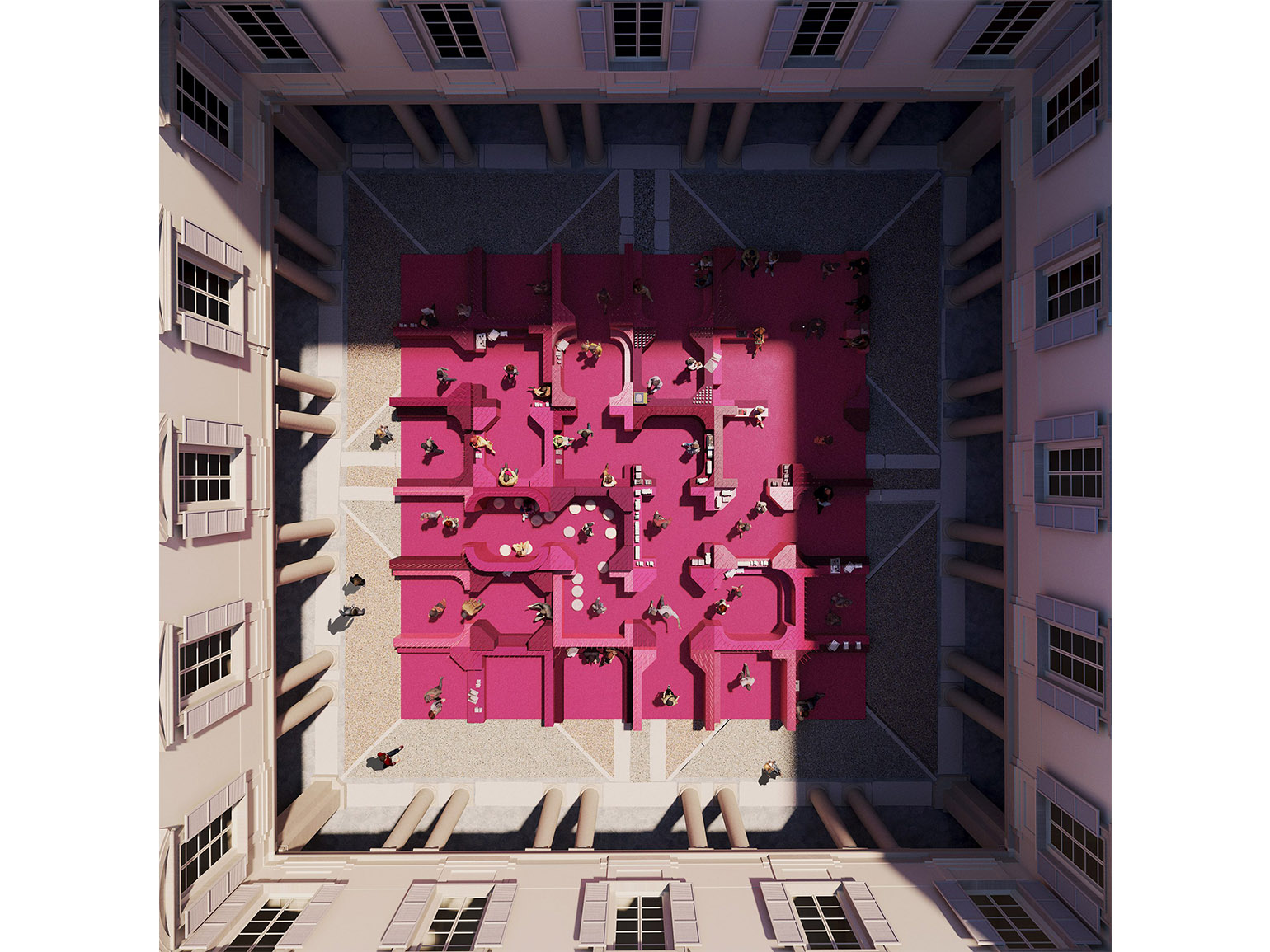 Metamorphosis in Motion — это игровой лабиринт ярко-розового цвета, который, по замыслу автора, полностью заполнит двор палаццо. По словам Готме, проект вдохновлён историей здания и его ролью как переходного пространства — между улицей и интерьером, публичным и частным. Архитектор переосмысливает двор не как фон, а как самостоятельный архитектурный сюжет.