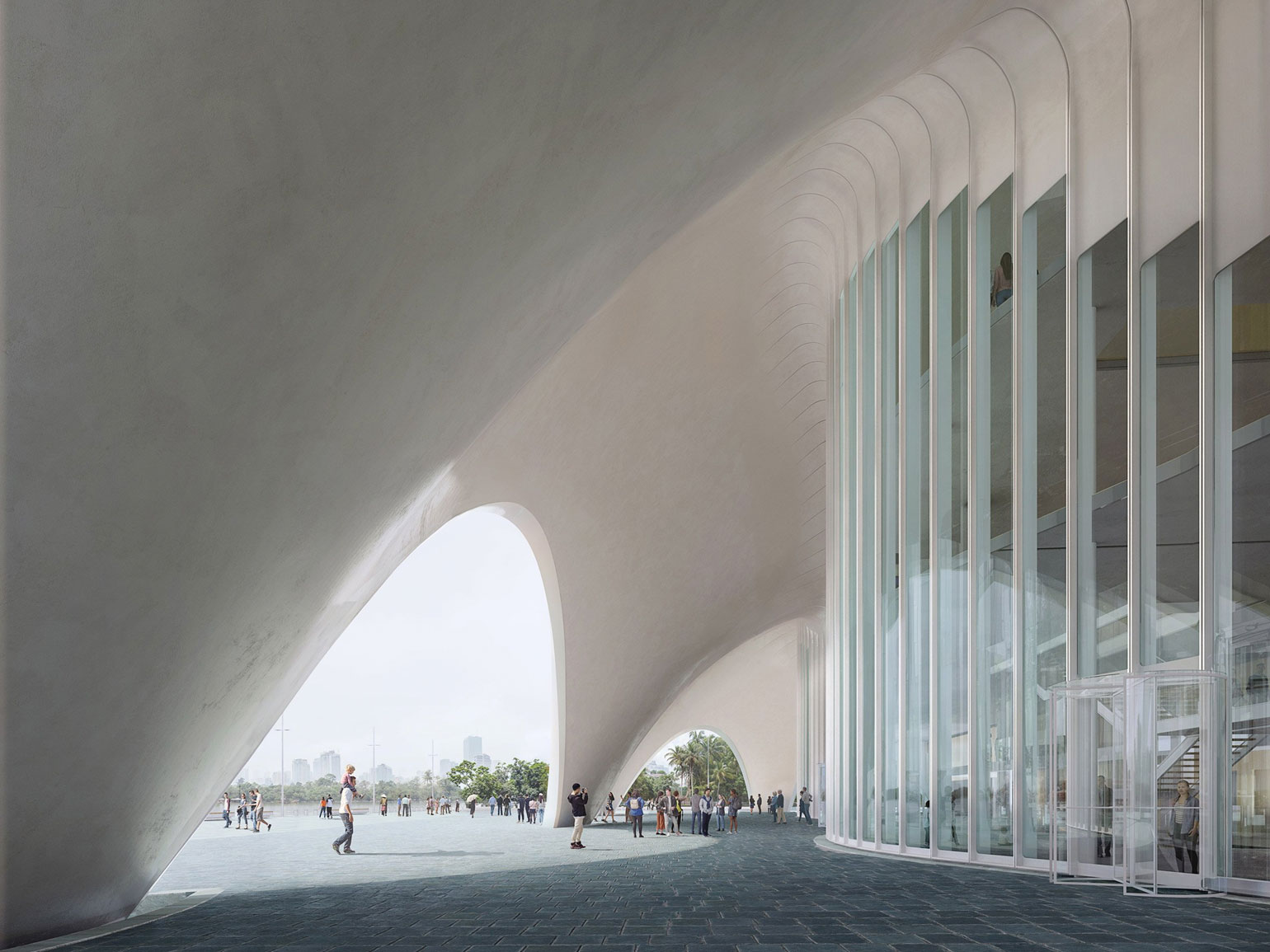 Здание построят из бетона: в нём будет оперный зал на 1800 мест и конференц-зал на 1000 мест. Его изогнутую крышу облицуют перламутровыми керамическими плитками разных размеров.