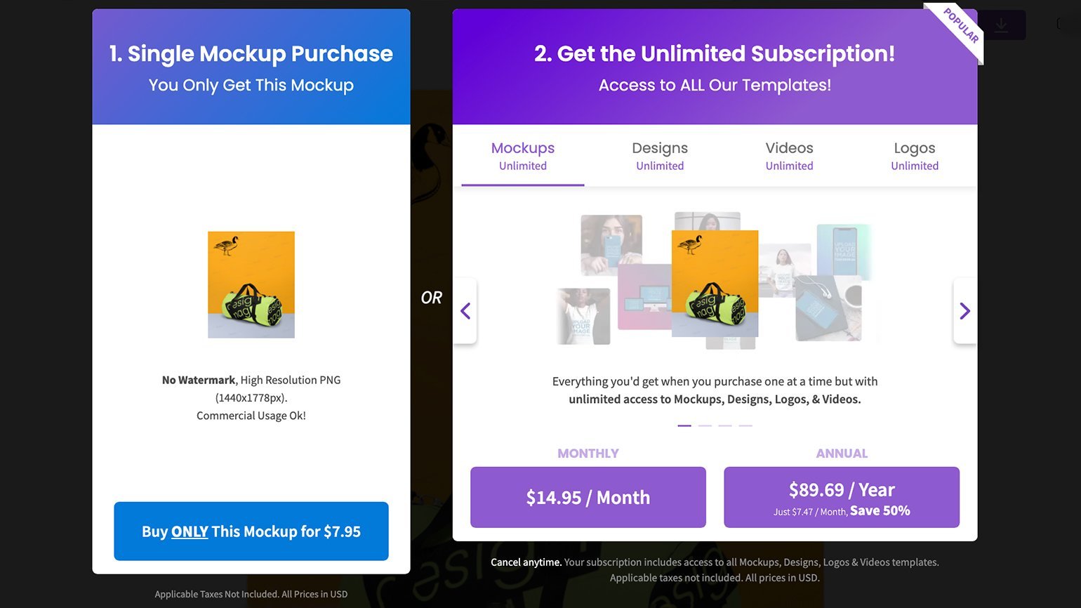 Платно: с подпиской уровня Pro вы получаете полный доступ ко всем 11 тысячам мокапов и всем функциям, можете экспортировать изображения в высоком качестве и без водяных знаков. Цены и условия тарифа здесь.