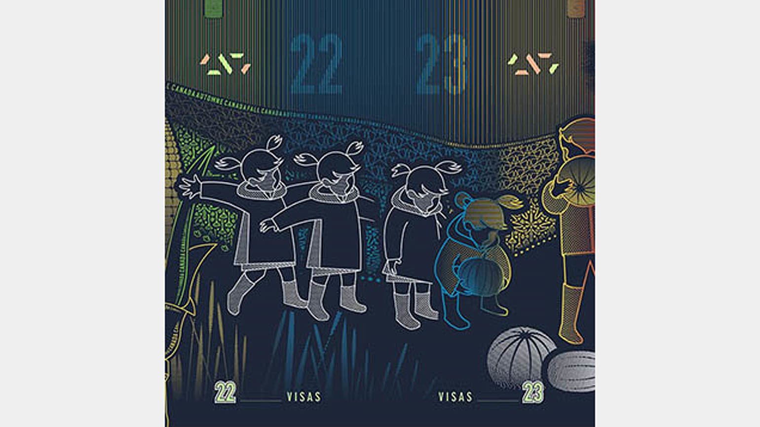 Иллюстрации будут изображать четыре времени года. IRCC показала осень и весну — детей с тыквами и медведицу с медвежатами. Под воздействием ультрафиолетового света страницы нежных цветов приобретают более яркие оттенки красного, жёлтого, зелёного и синего.