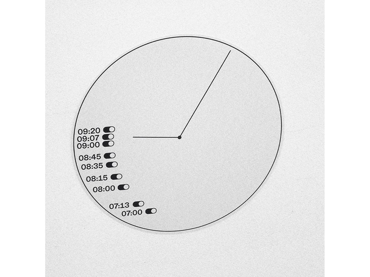 Артём Матюшкин: В каком-то смысле мы используем образ измерителя рутины, чтобы выйти из рутины. У нас один из первых циферблатов как раз про часы работы Non-Objective. Он, конечно, старый. Он про то, что рабочие часы тянутся будто бы долго, а всё, что между ними, схлопывается.