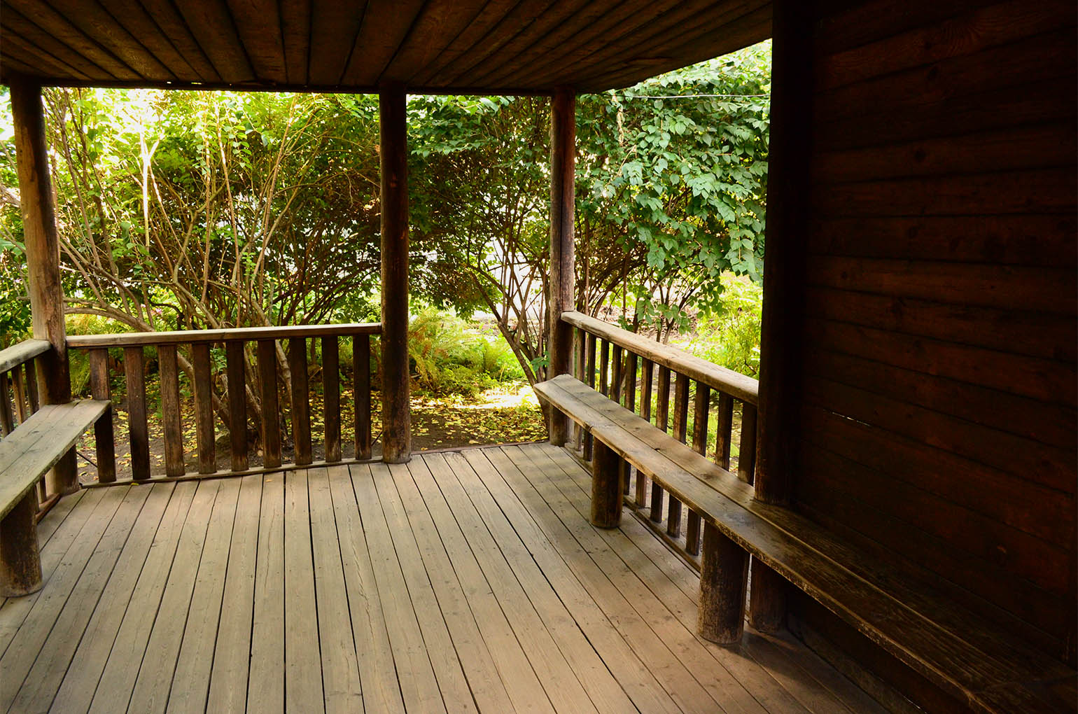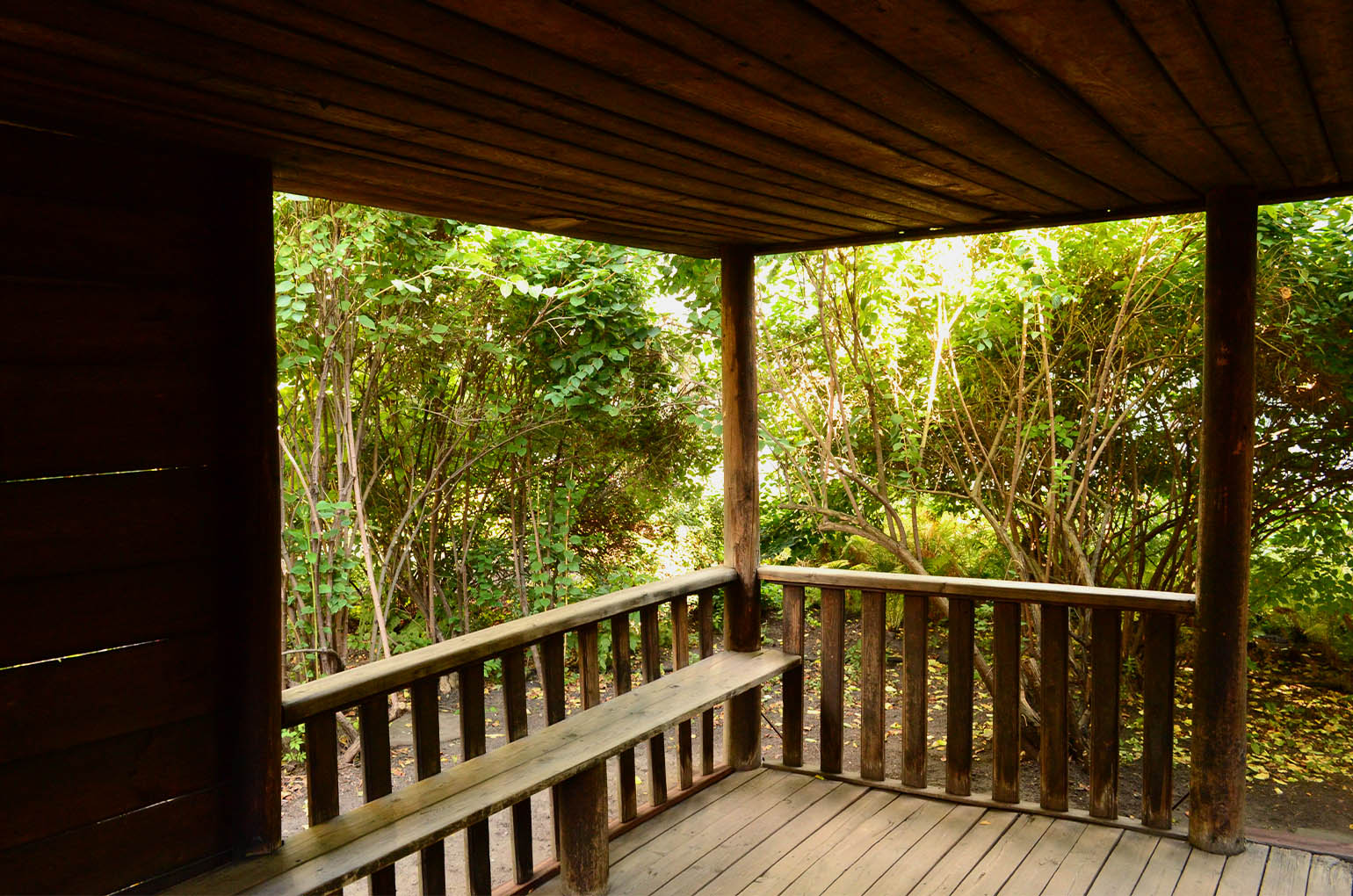 За террасой — сад: густая, потемневшая от влаги зелень, тяжёлые ветви слегка наклонены. В глубине угадывается деревянная постройка. Над всем — пасмурное, но уже светлеющее небо. И ни одного человека — только след его присутствия.