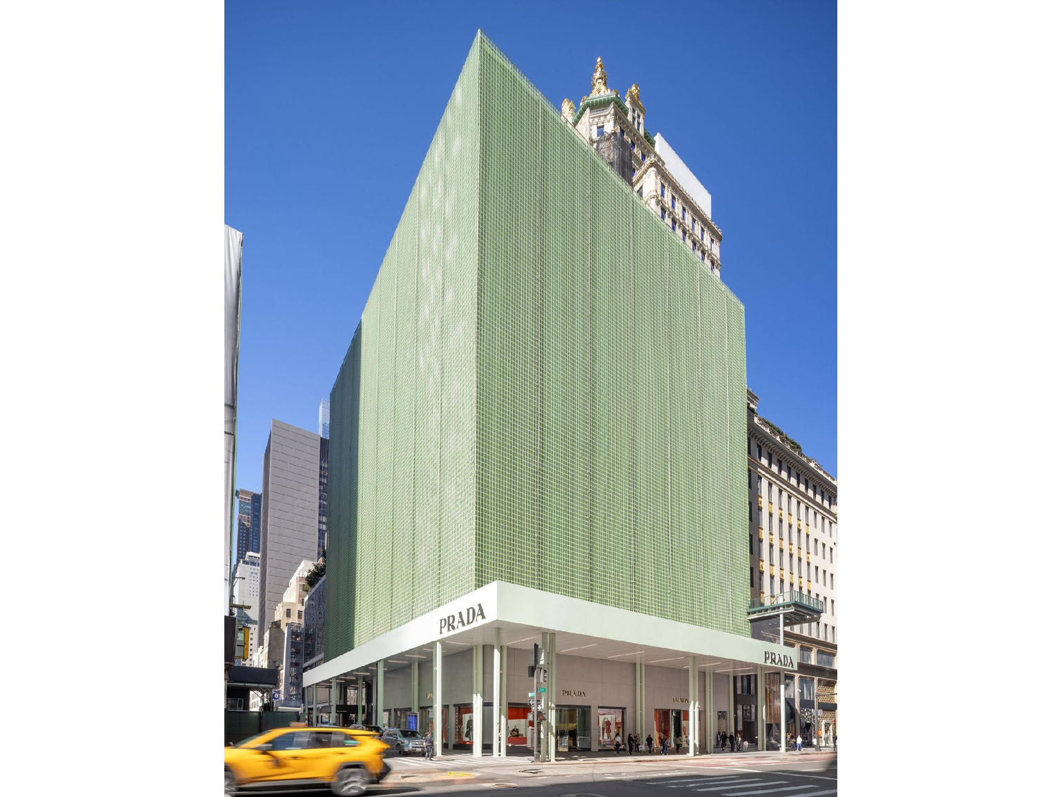 Проект покрывает две фасадные стороны здания и построен из стандартных металлических лесов, окрашенных в фирменный зелёный цвет Prada. Поверх конструкции натянут полупрозрачный материал — scrim (лёгкая ткань на бумажной основе, которую часто используют в театральных декорациях). Его уложили в два слоя и напечатали на них разные узоры, чтобы добиться эффекта муара — визуальной ряби, меняющейся при движении и изменении освещения.
