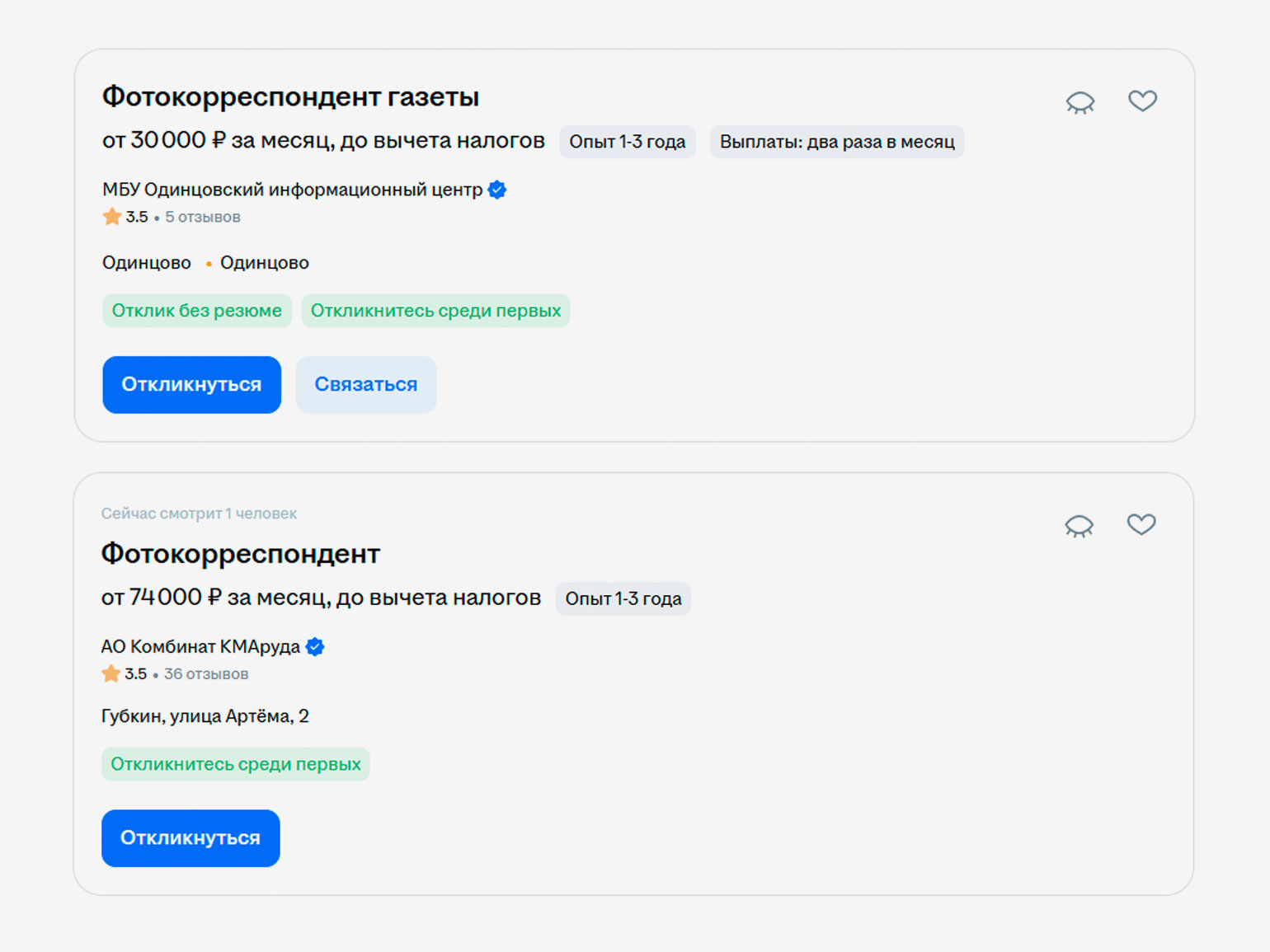 Фотокорреспонденты работают в разных местах: редакциях крупных новостных порталов, печатных изданий, информационных агентств и телеканалов. Многие выбирают фриланс, совмещая репортажи для медиа с документальными проектами, съёмками для НКО или культурных организаций.