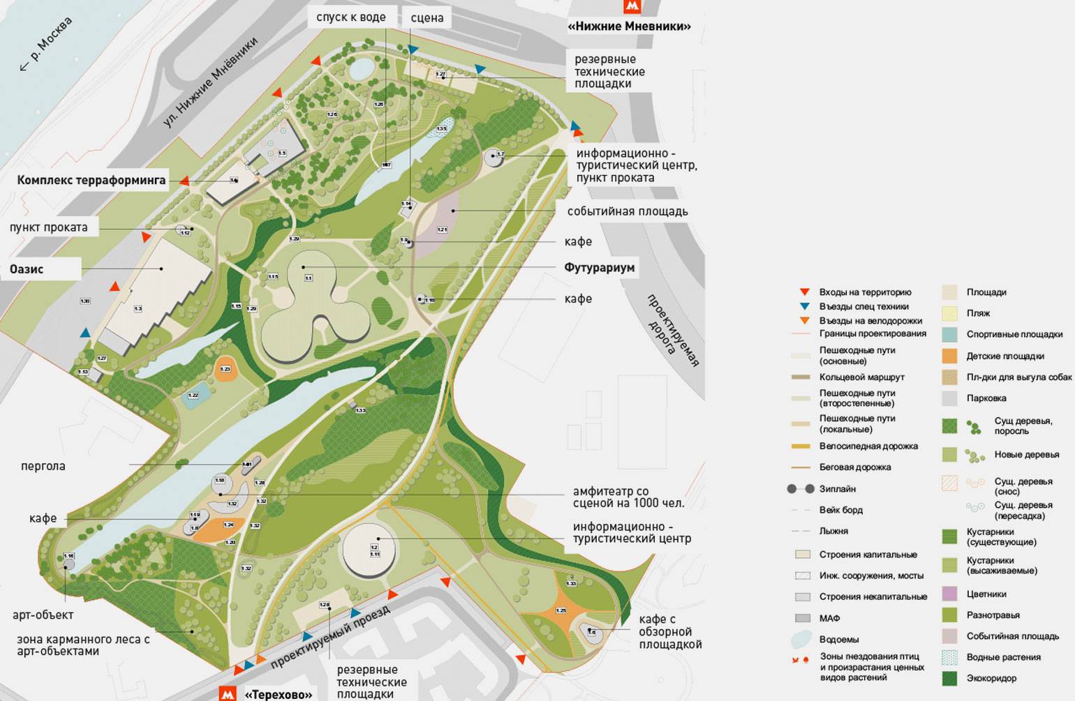 На основе анализа появляется общая идея пространства — как оно будет выглядеть и работать. Специалист определяет функциональные зоны (детская, тихий отдых, спорт, прогулки с собаками, событийная площадь…), их взаимосвязь и какие они могут создать ограничения.