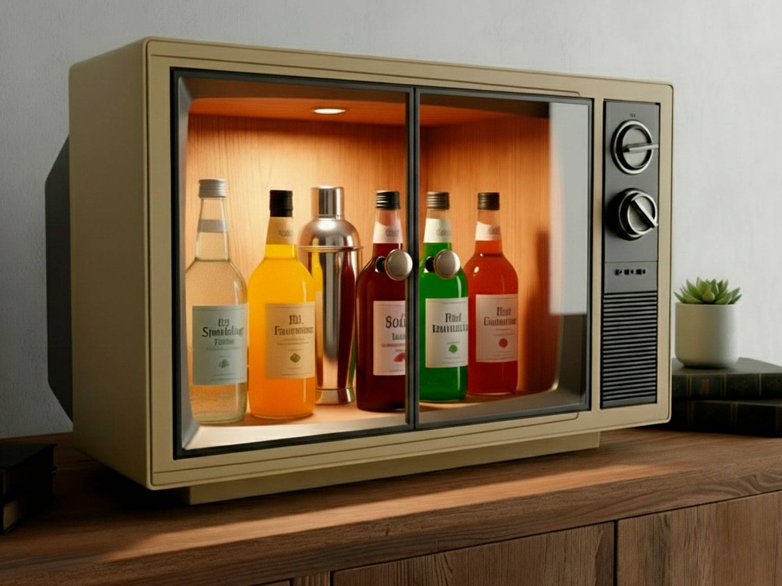 - Мини-бар из ретротелевизора. Достаточно извлечь кинескоп и декорировать корпус внутри (самое простое — оклеить обоями), прикрепить распашные или раздвижные дверцы, и можно добавить LED-подсветку.